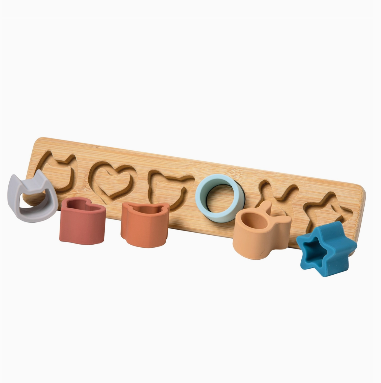 Six food-grade silicone shapes in subtle colors with smooth bamboo tray. Packaged in a branded box