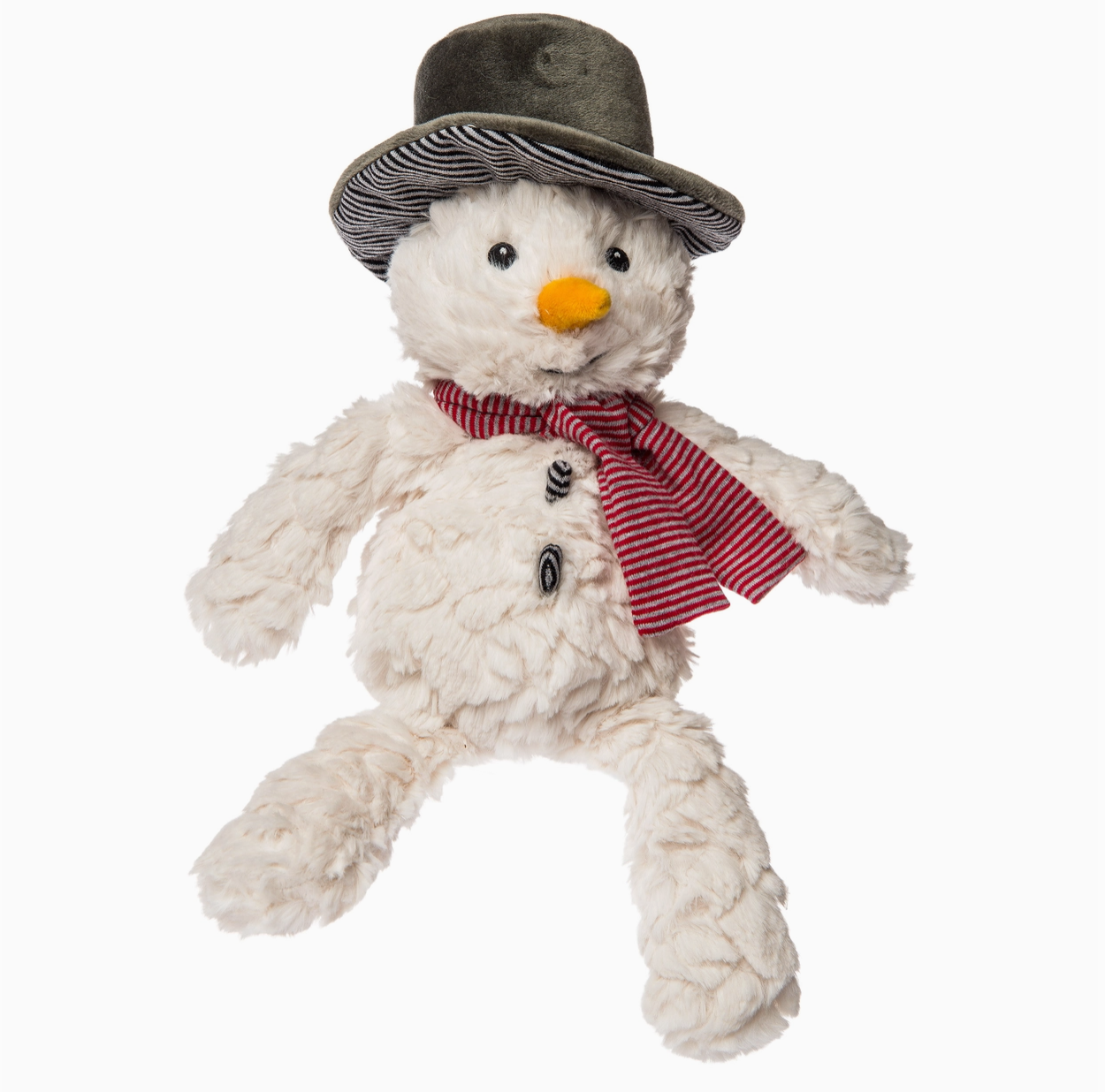 Putty Blizzard Snowman is a sweet and soft winter friend made with textured, snow white Putty fabric. With a fabric carrot nose and embroidered eyes for total softness; Blizzard is dressed for the season in a top hat and striped sewn-on scarf. He’s a great holiday gift or a keepsake home holiday decoration. Measures approximately 11-inches tall. Weighted bums and feet add to floppiness. Care for by washing in cold water on gentle cycle, air dry; soft toy made to strict quality standards to meet or exceed US Safety requirements.