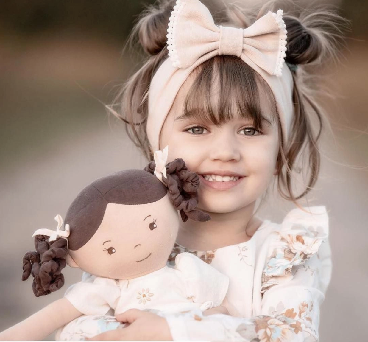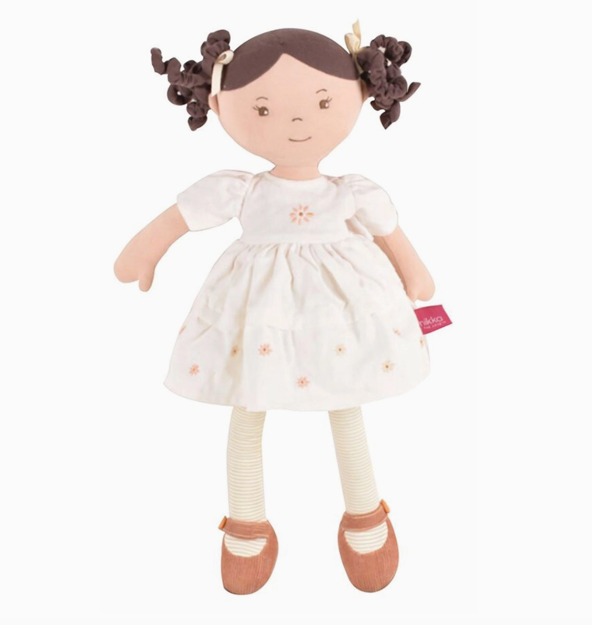 Cecilia is a soft doll toy and is wearing a beautiful cream all-natural linen dress with matching brown shoes, cream tights, and cream hair ribbons. Cecilia's dress is removable for easy cleaning or you could dress her up in a different outfit for a special occasion. Size: 16.5 in Ages: 0+ months Features: Soft body doll with plush hair and embroidered facial features Dress - 70% Cotton 30% Flax Skin and Hair - 100% Cotton Single Jersey Legs - 100% Cotton Printed Single Jersey Filling -100% Recycled PET Fibers Safety Standards: This product complies with European EN71, US ASTM F963 Standards. For light cleaning, wipe the surface of this ragdoll toy with soapy water and a damp cloth.