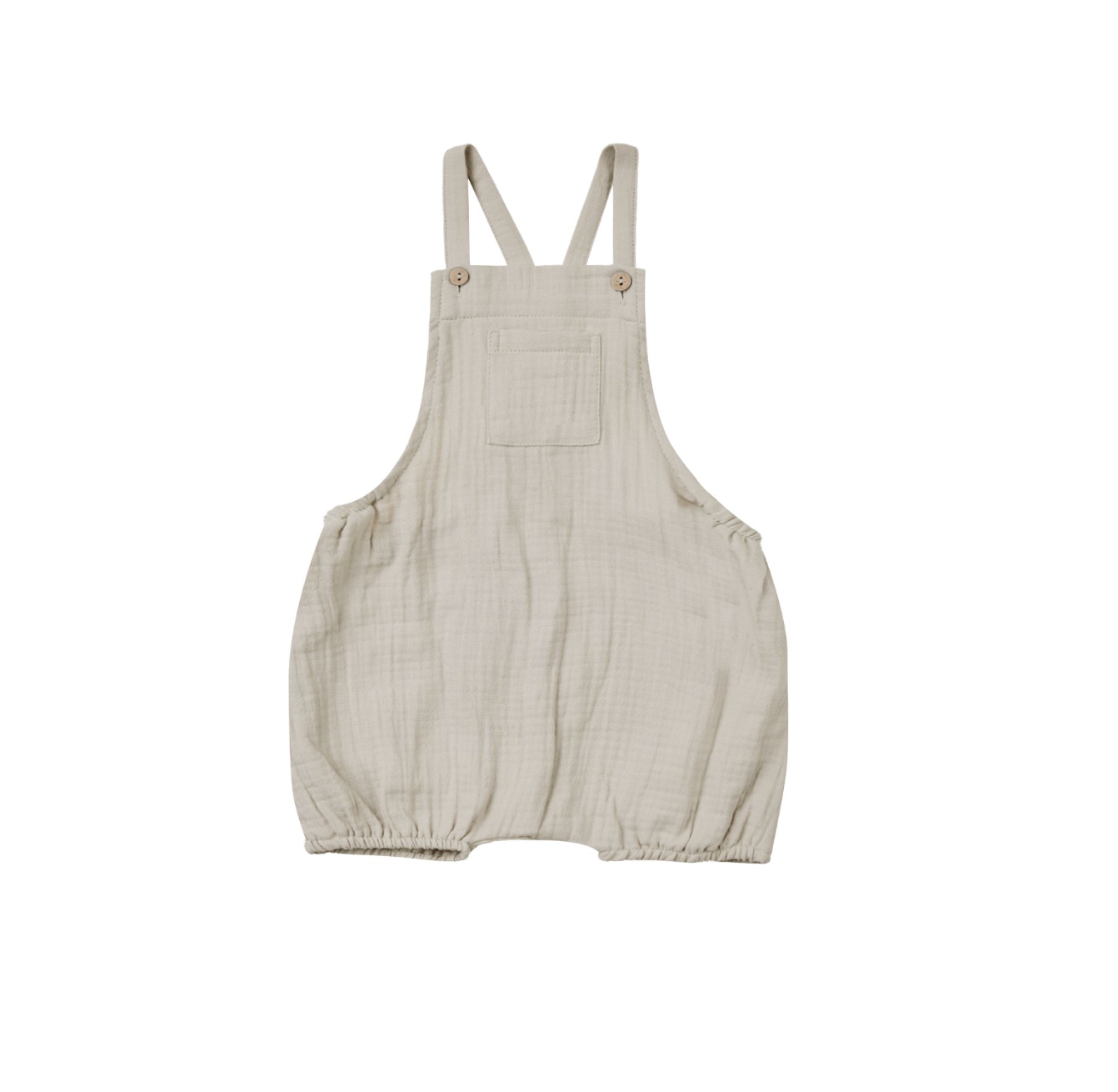 Woven overall romper featuring buttons on the straps, open bib pocket, and elastic leg openings.