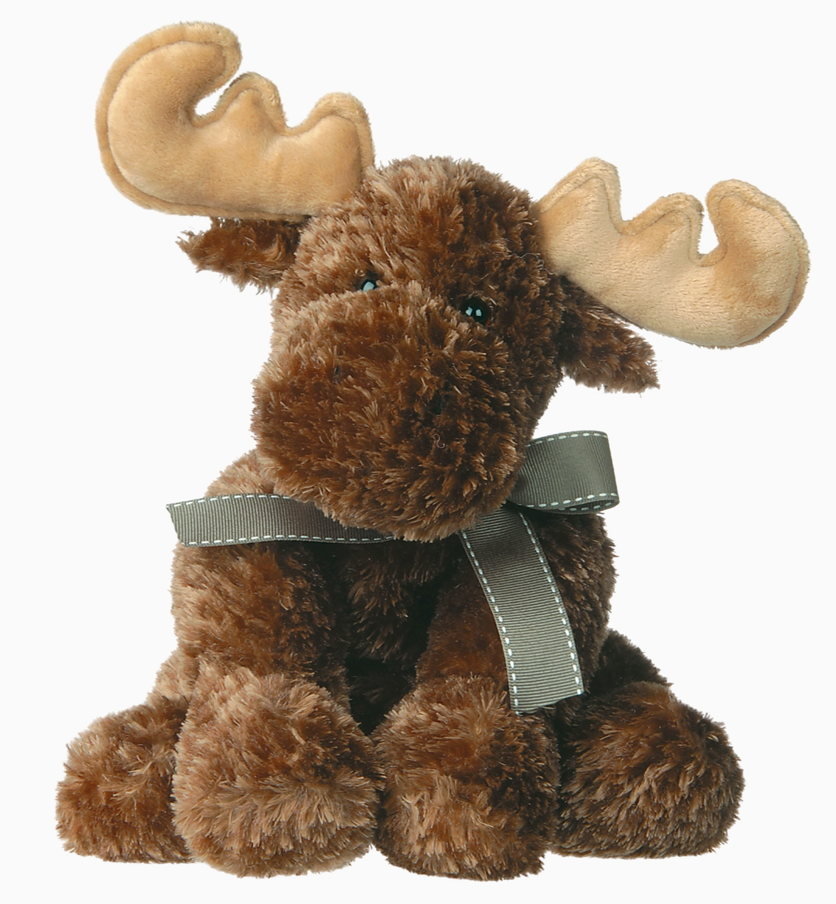 Lil Miles Moose has Incredibly soft textured fur, a cute innocent expression, and velvety soft antlers. He’s all set for cuddles. Stitched sage green bow dresses him up.