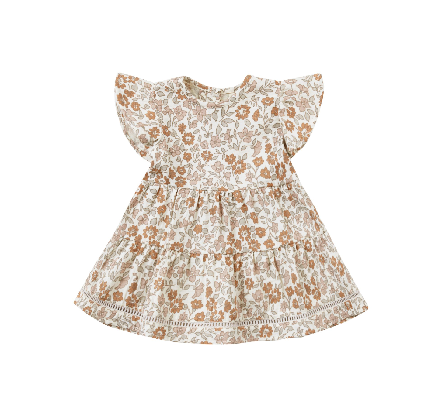 Multiple tiers, ruffles, and trims make up this beautiful short sleeve Belle dress in our organic cotton gauze fabric, complete with button-back neck closure. All sizes include bloomers.