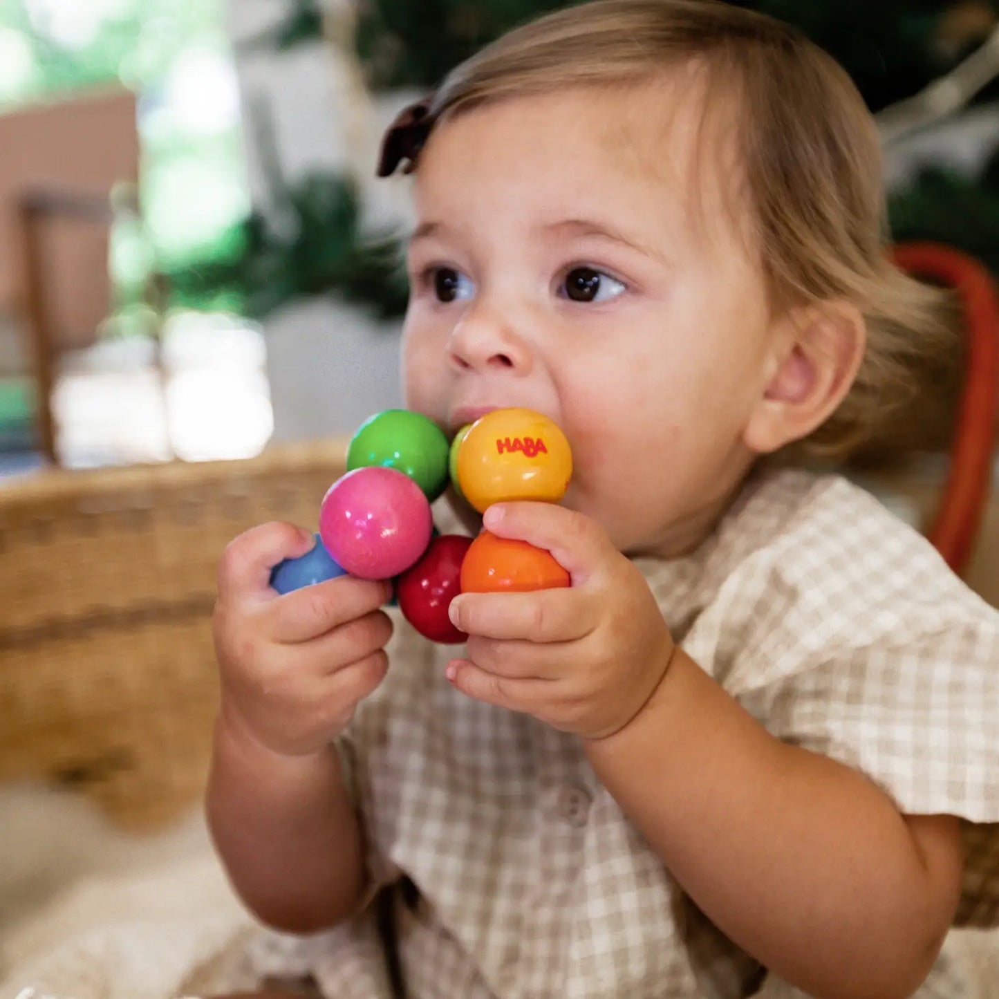 This hand-crafted Magica colorful clutching, teething, wooden toy is easy to grasp for the young children's hands and perfect for babies aged 6 months and up. For first grabbing and rattling.