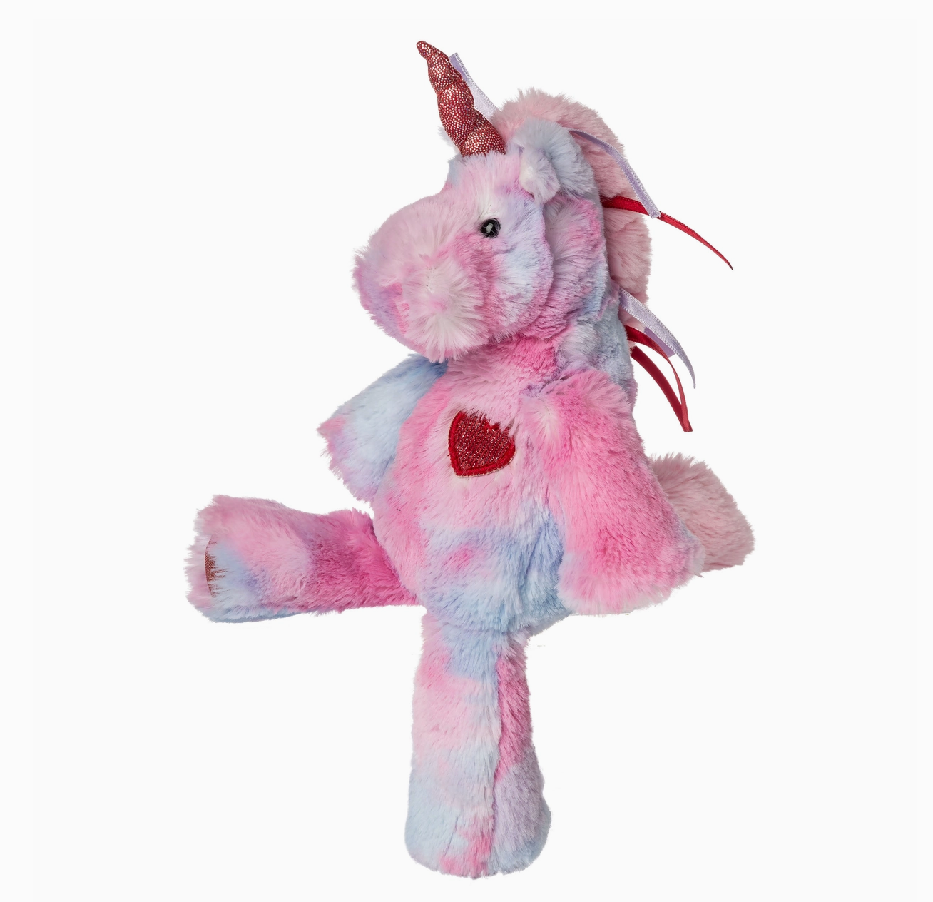 Marshmallow Zoo fabric, tye dyed with sparkly trim and ribbons. A consumer favorite for years, they have weighted bums and feet and slouchy bodies and are fun to carry and curl-up with.