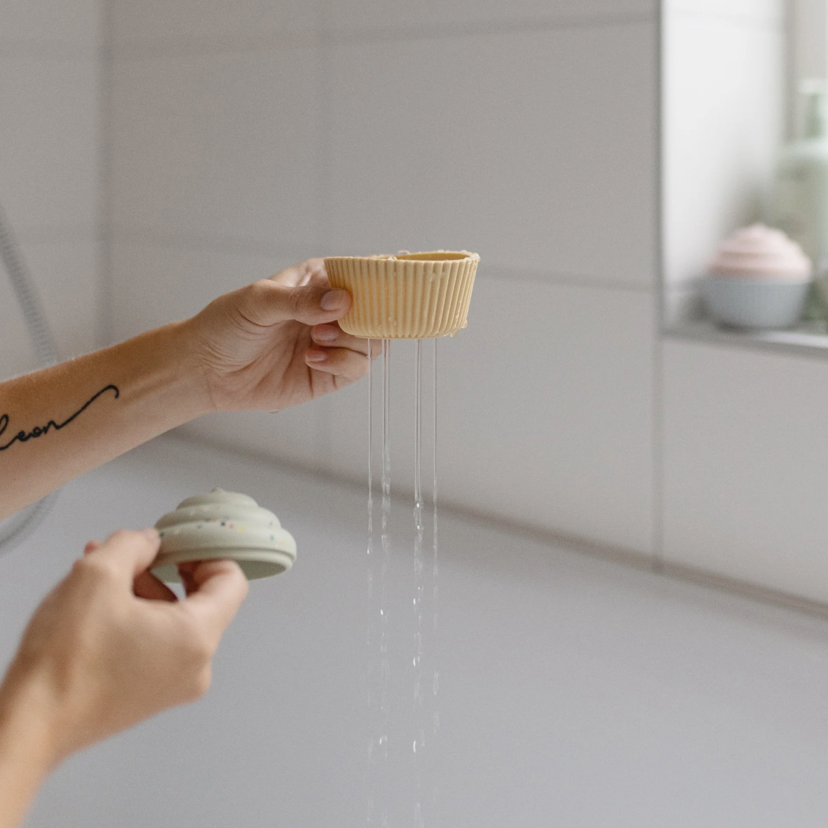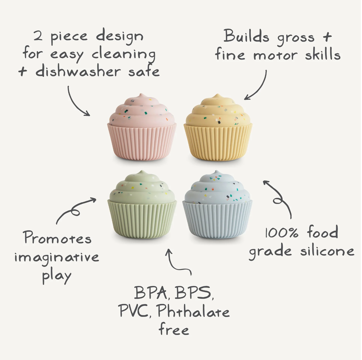 Add a pinch of sweetness to playtime with our mix and match silicone cupcakes. Made in four delicious shades, littles can practice color matching or get creative and cook up their own combinations. The sprinkled frosting top and squeezable silicone base easily separate and reattach to help develop fine motor skills and hand-eye coordination. With small draining holes on the bottom for easy cleaning, these cupcakes are a charming addition to play kitchens, tea time, or bath time.