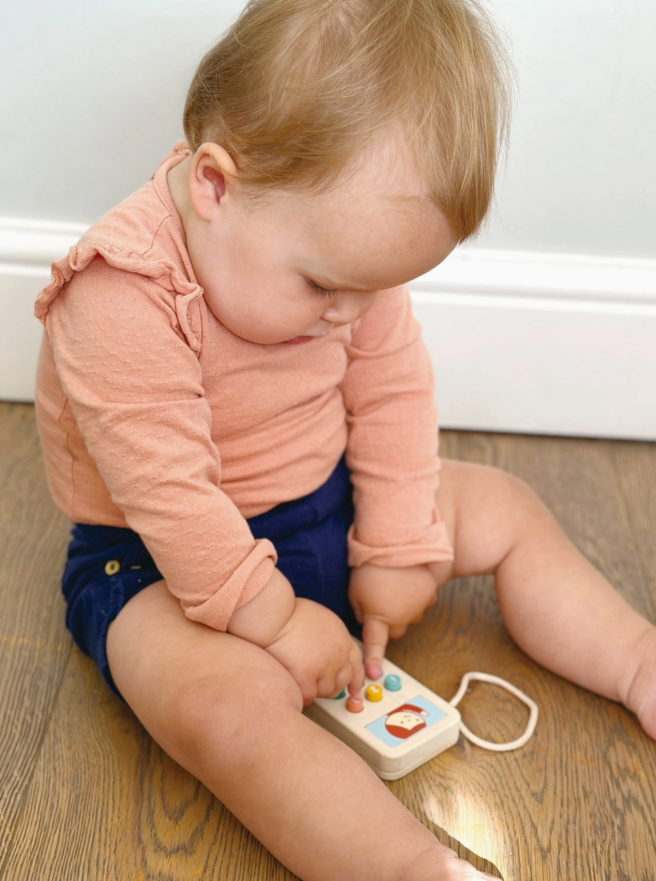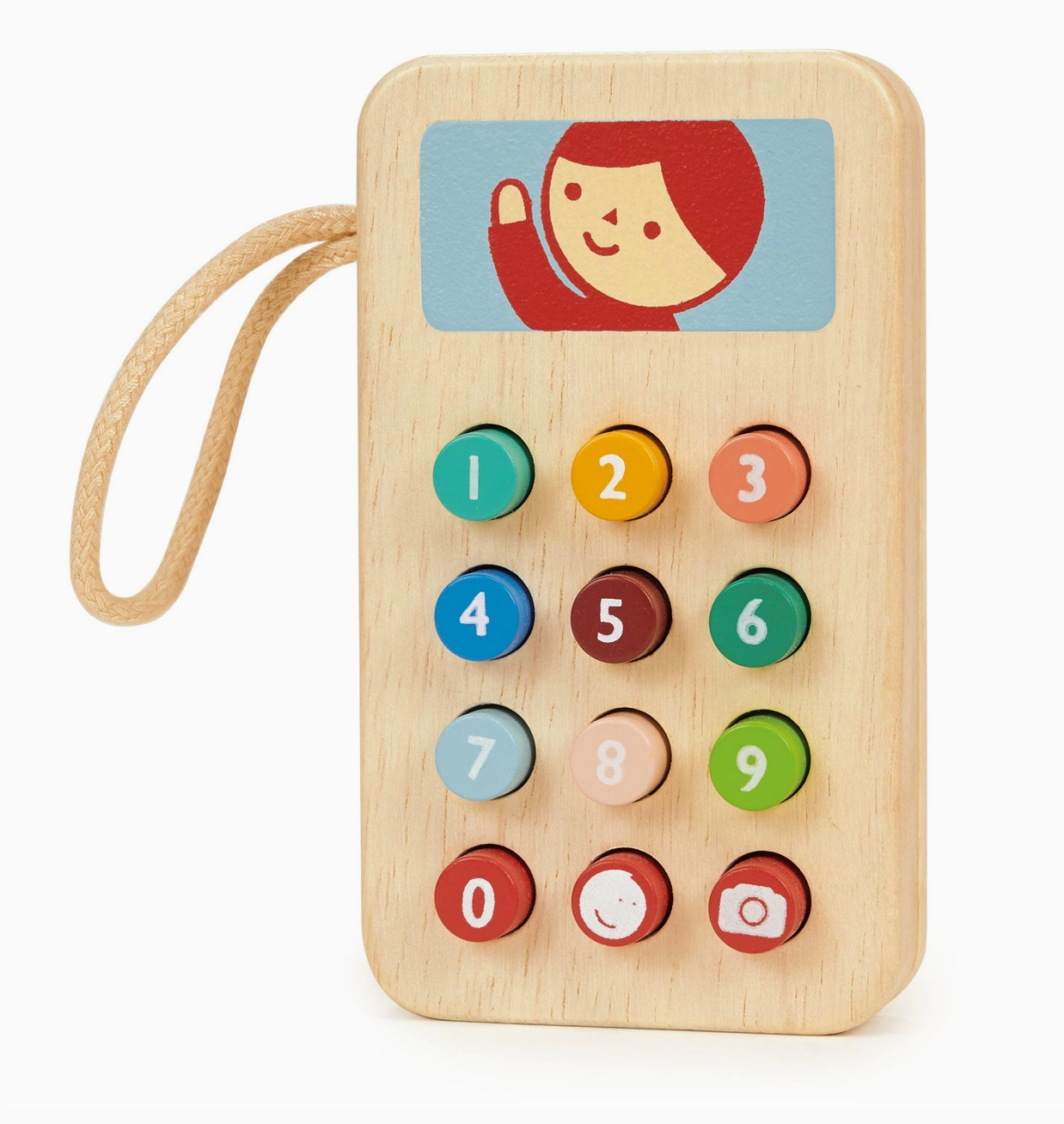 This pretend wooden mobile phone has 12 squishy coloured buttons to press and an illustrated picture. It also comes with a cord handle.
