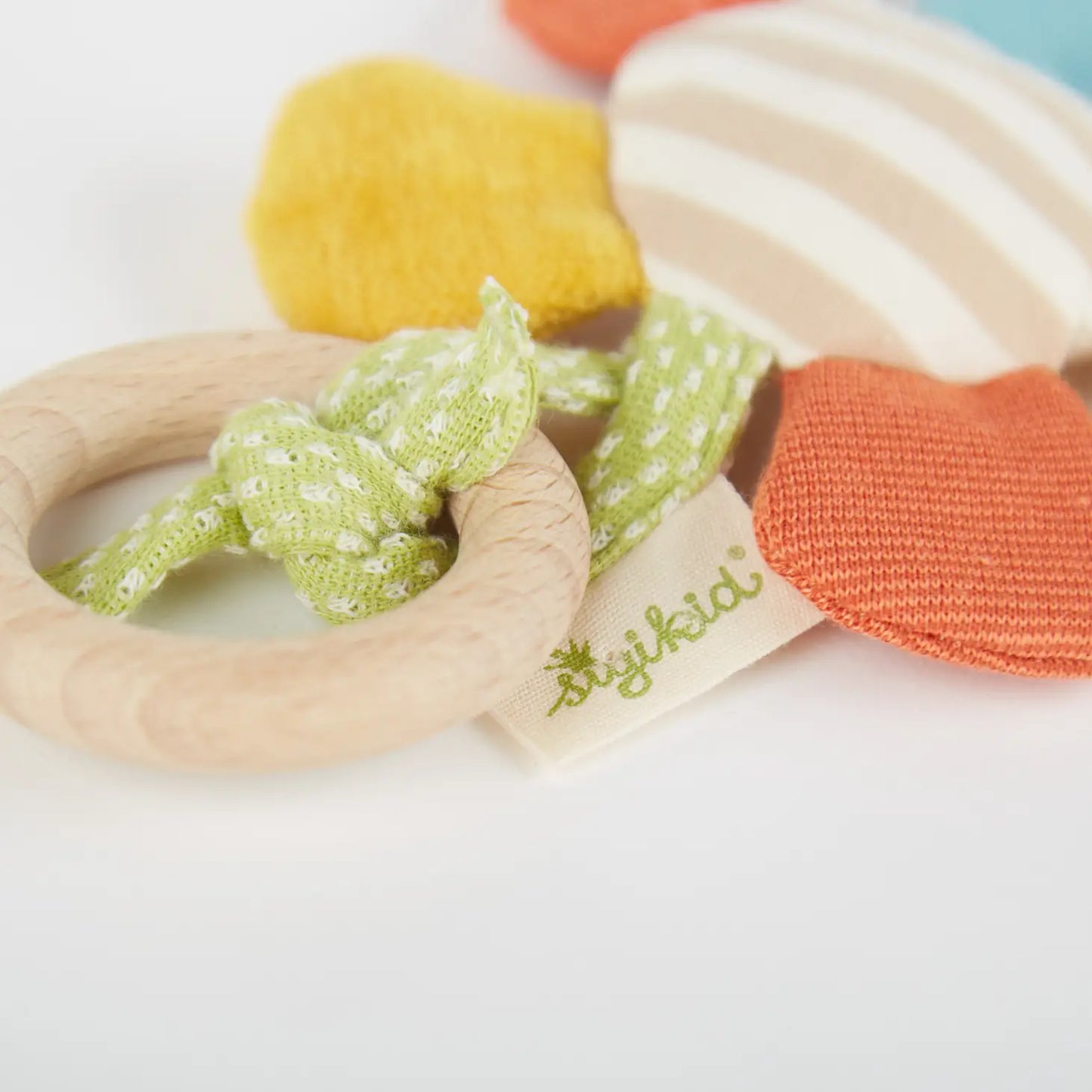 Rattle with Beechwood Teething Ring. Size: 4.7" Age: 0-3 Years Material: Certified organically cultivated cotton.