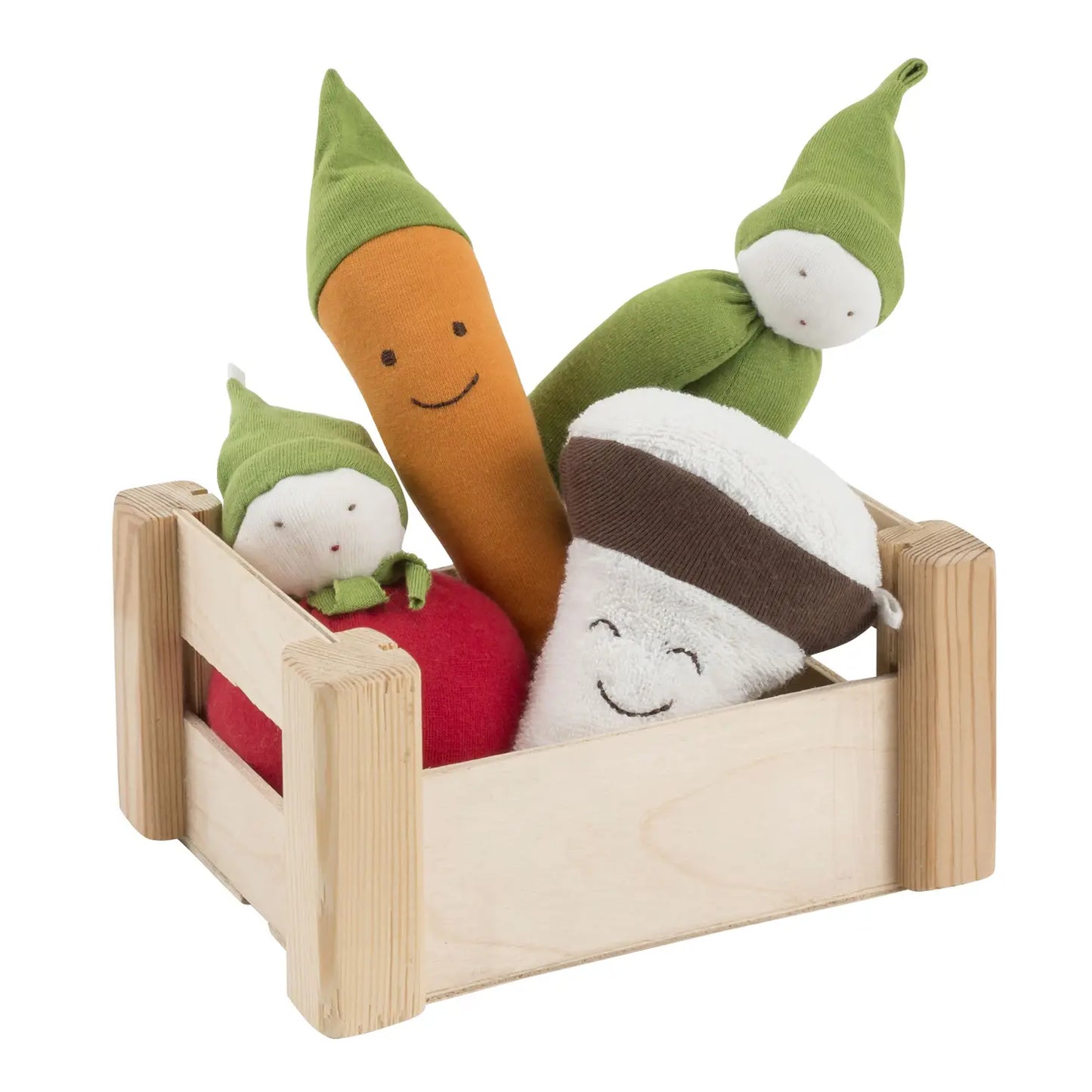 A best-selling toy, our Veggie Crate Toddler Gift Set is a curated gift set of our renowned collection of stuffed organic fruits and veggies toys that are destined to be baby's favorite. Made with 100% organic Egyptian cotton, our stuffed vegetable toys are safe for little foodies.