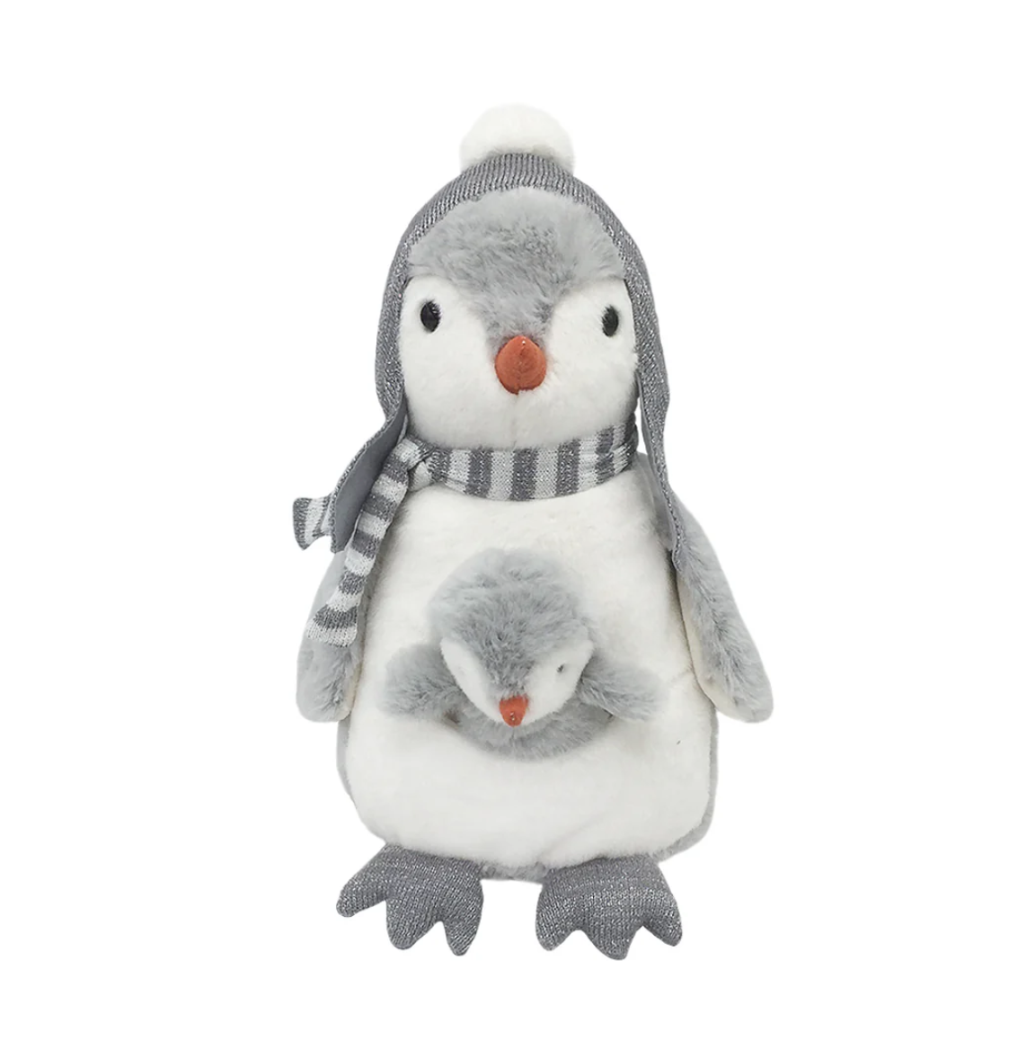 Meet Pebble and her sweet little baby. This adorable little penguin plush toy is always ready for cooler temperatures with his knit scarf and hat. And little pocket holds a surprise...a little penguin baby. Super soft and ready to cuddle, our one-of-a-kind penguin plush toy is ideal for the stuffed animal lover who needs something extra-special in their collection.