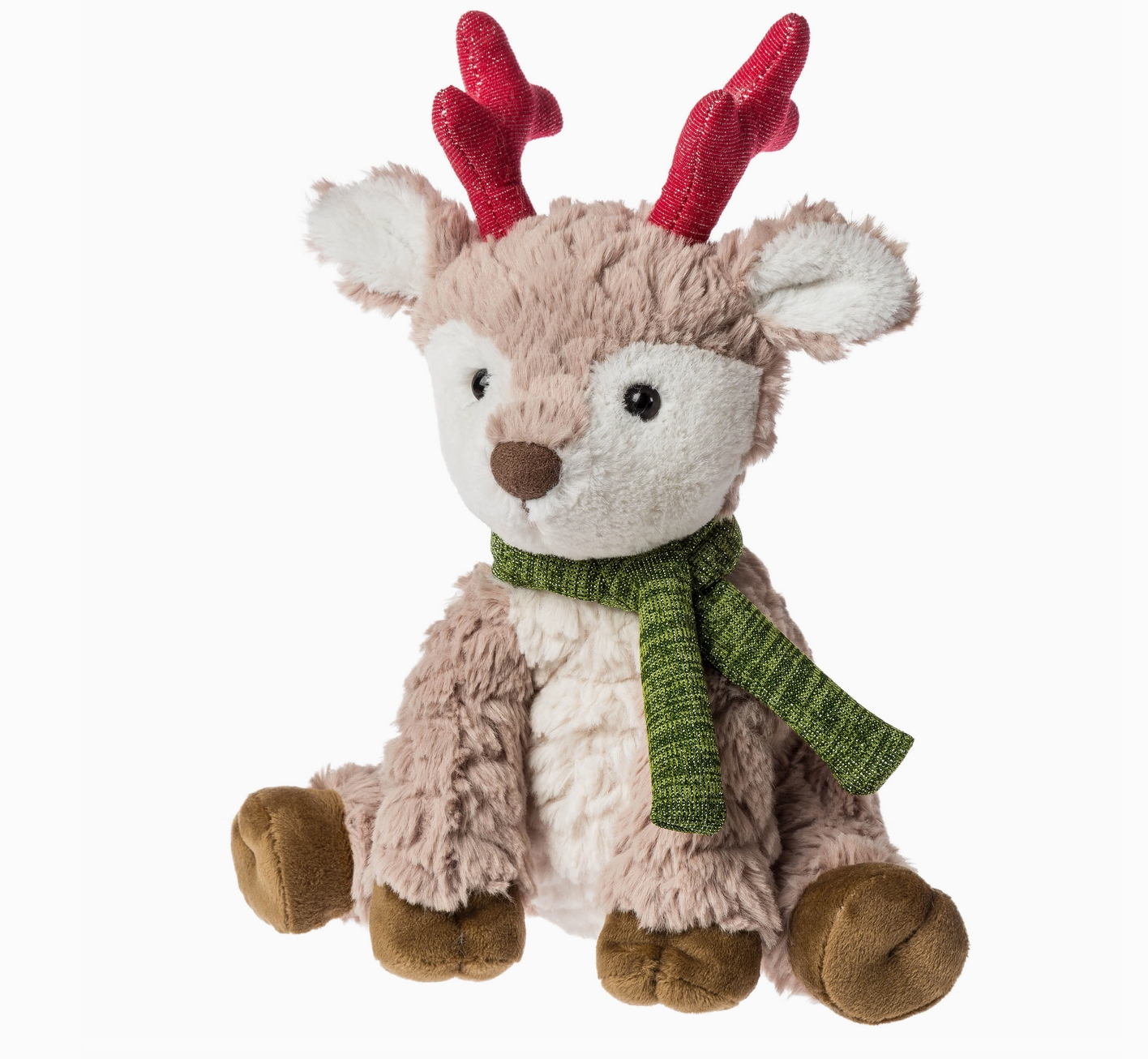 Putty Sleighbells Reindeer is a sweet friend with super soft, textured fabric in tan and white with sparkly fabric antlers and a stitched-on fabric scarf. Measures approximately 11-inches tall. Weighted bums and feet add to the floppiness.