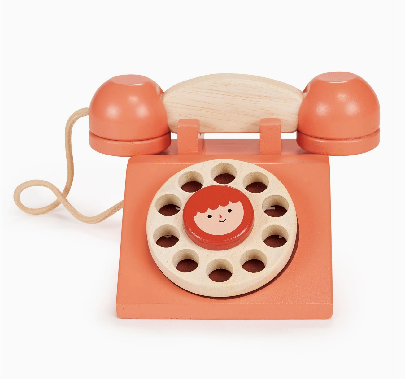 This old fashioned wooden telephone toy has a removable receiver attached with a cord, and a finger dial that goes round, with an illustrated face.