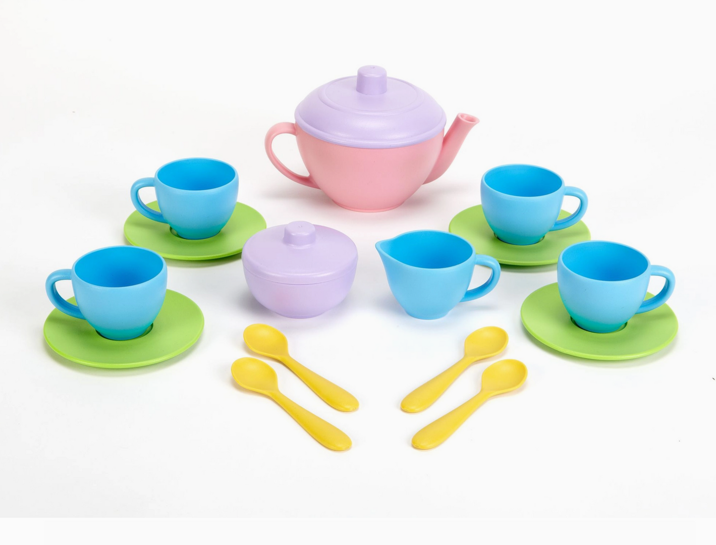 Talk about green tea!! Young hosts can serve up a pot of tea while doing something really good for the earth. Like all Green Toys™ products, our Tea Set is made from eco-friendly materials, helping to reduce fossil fuel use and CO2 emissions, all in the name of Good Green Fun™! Meets FDA specs for food contact. Dishwasher safe.