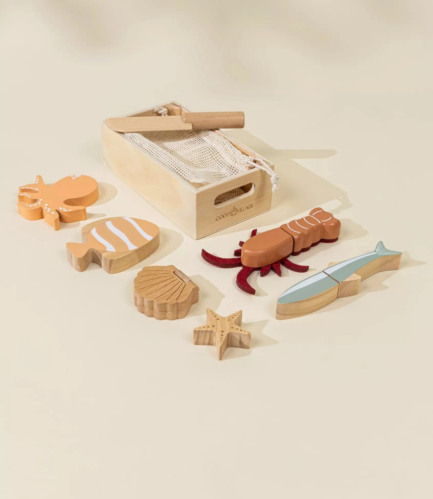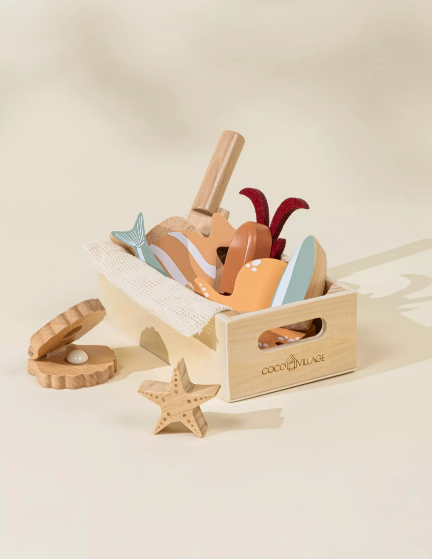 Immerse your little explorers in an ocean of excitement with this captivating Wooden Seafood Playset!