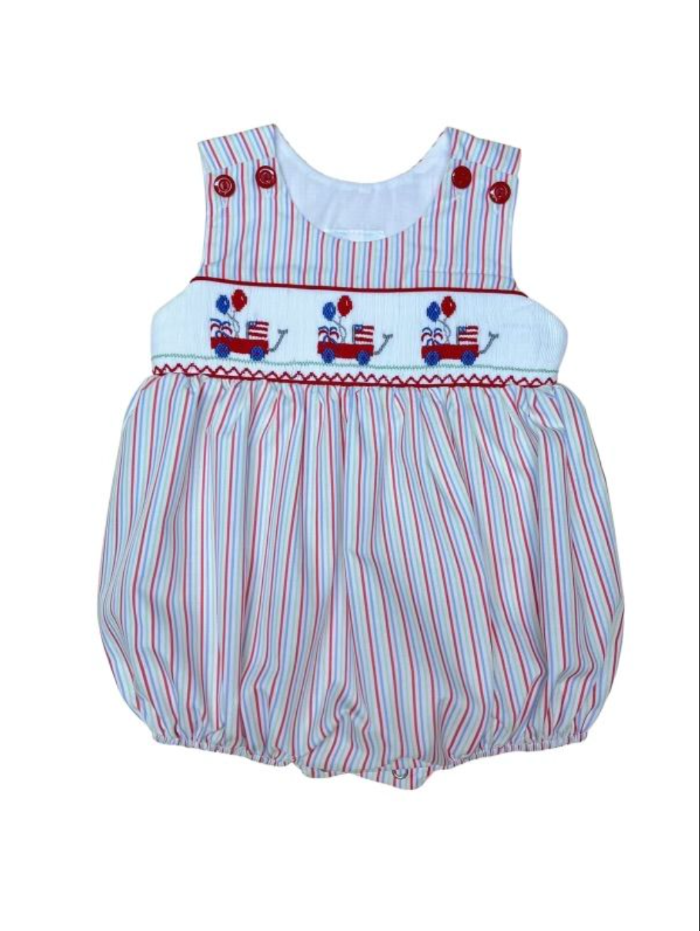 This sweet boy's smocked bubble with American flag, wagon and balloons is perfect for celebrating the 4th of July holiday!