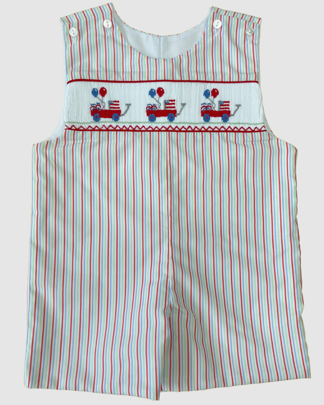 Sweet boys smocked shortall with American Flag, Wagon and balloons.