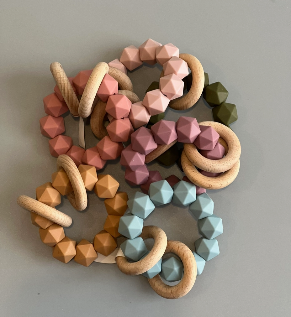 The Abby rattle is part of our Classic Collection which has over 50 color selections across several product categories such as teethers, clips, and rattles. Mom and baby will get the best of both worlds because the Abby rattle is BPA free silicone and all natural beech wood also doubles as a teether.