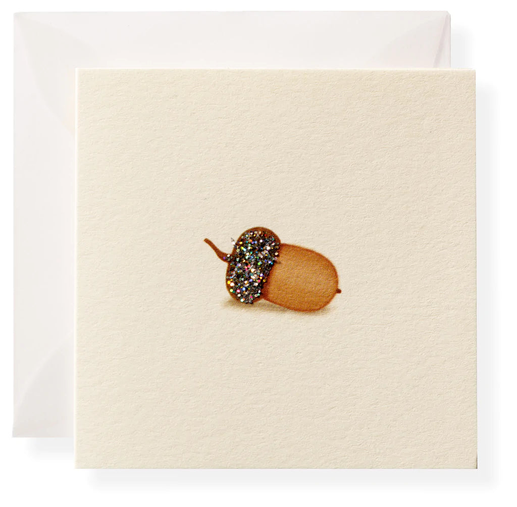 Our Acorn Gift Enclosure is printed and hand-glittered in Memphis, TN. Hand crafted artwork, full color ink printed on natural white paper, hand-glittered, and paired with a vellum envelope. Book-folded enclosure card, blank on the inside. Paper color | natural white. Envelope color | vellum. Print process | full color. Embellishment | hand-glittered. Dimensions | 3 x 3 inches.