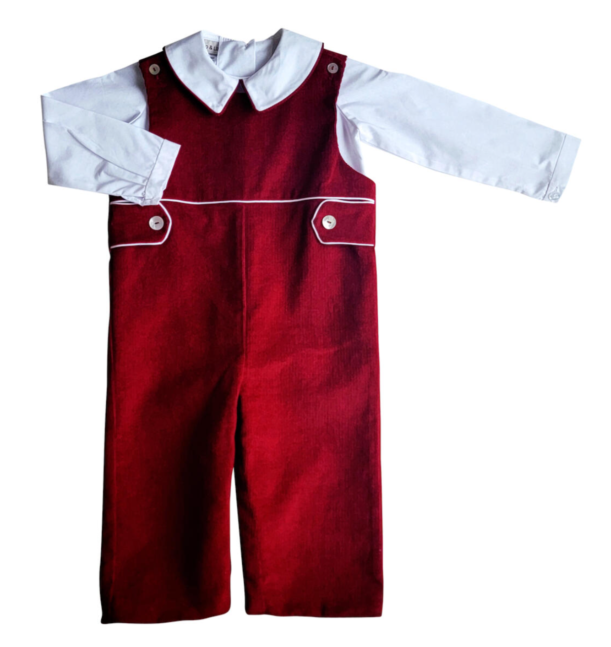 Boy's burgundy color corduroy overall 2-piece set. White long sleeve top. Tabs on the side. 100% cotton. Made in El Salvador