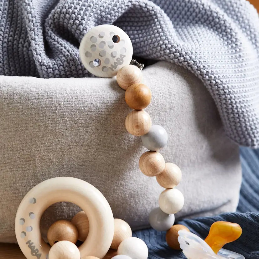 Two beautifully crafted wooden baby toys in one! You get a wonderful clutch toy/teether and a pacifier chain that make this an ideal birth gift set!