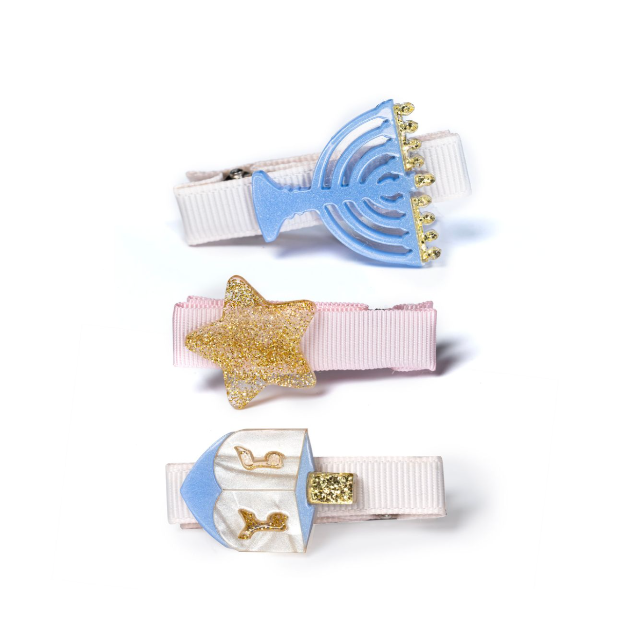 Celebrate the season with these Baby Star Menorah Dreidel Blue Hair Clips.