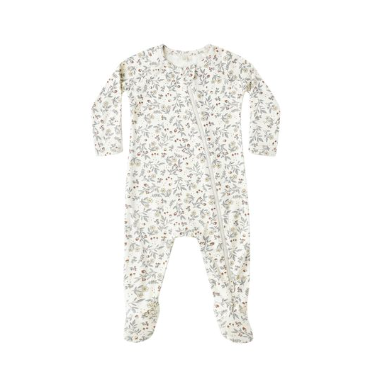 Full double-zip footie crafted from our soft and stretchy bamboo fabric. Fold-over hand mitts included on sizes NB – 3-6M. Raised screen print on soles of size 6-12M for added traction.