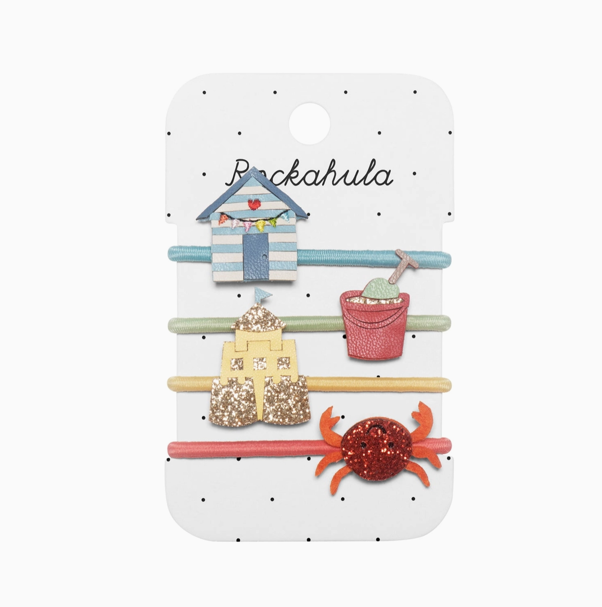 All things fun at the beach adorn this set of four ponies. With our striped beach hut, a bucket and spade, a sweet snappy crab and a glittery sandcastle all on bright coloured elastics! Matching clips, scrunchies, bag and headband also available. Made with recycled felt, glitter and PU. Not suitable for children under 36 months due to small parts. Style code: H2326M