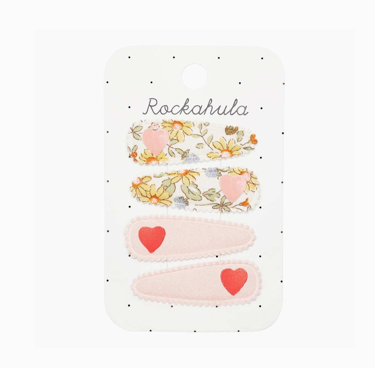 Mix and match this lovely pack of four clips, two clips featuring our bramble floral print, and two in soft pink with PU hearts.