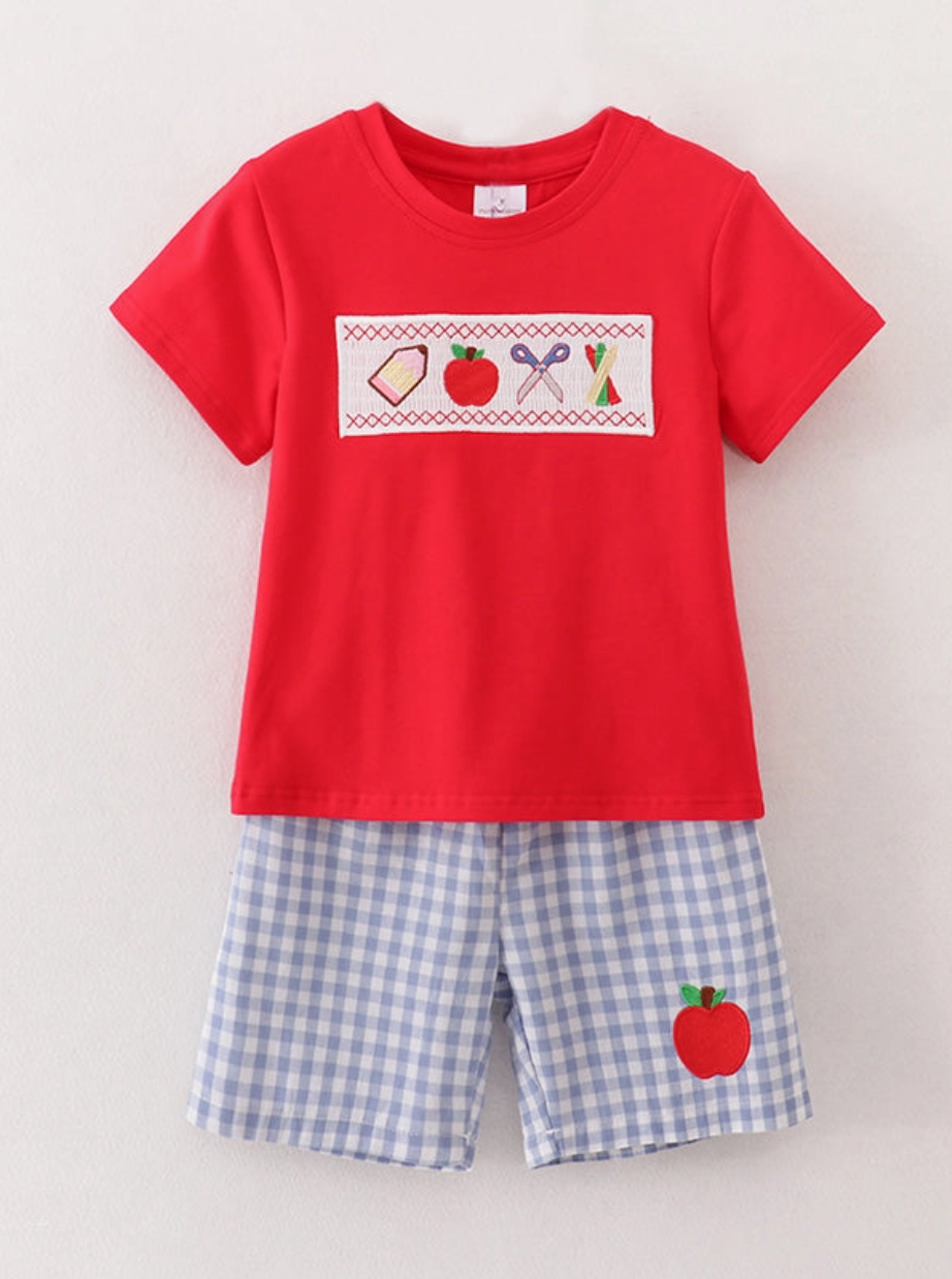 Get ready for the new school year in style with our Boys Back to School Pencil Apple Embroidered Plaid Shorts Set. Be the coolest kid in class with the playful pencil and apple embroidery, and stay comfortable all day with the soft plaid shorts.