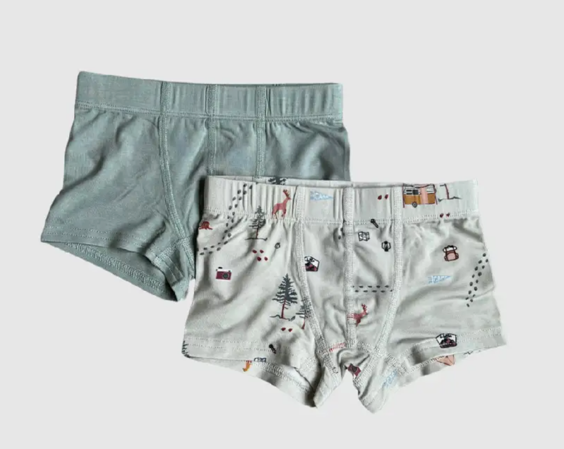 Our boy's boxer set comes with 1 print and 1 matching solid color. Our boxer style for toddlers up to big kids features a tight fit with our favorite bamboo/spandex jersey. Comfortable and no bunching.