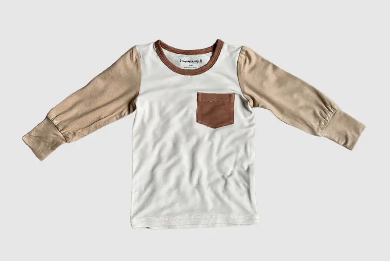 Relaxed fit on this new colorblock pocket shirt for boys. match this top back wheat or caramel joggers.
