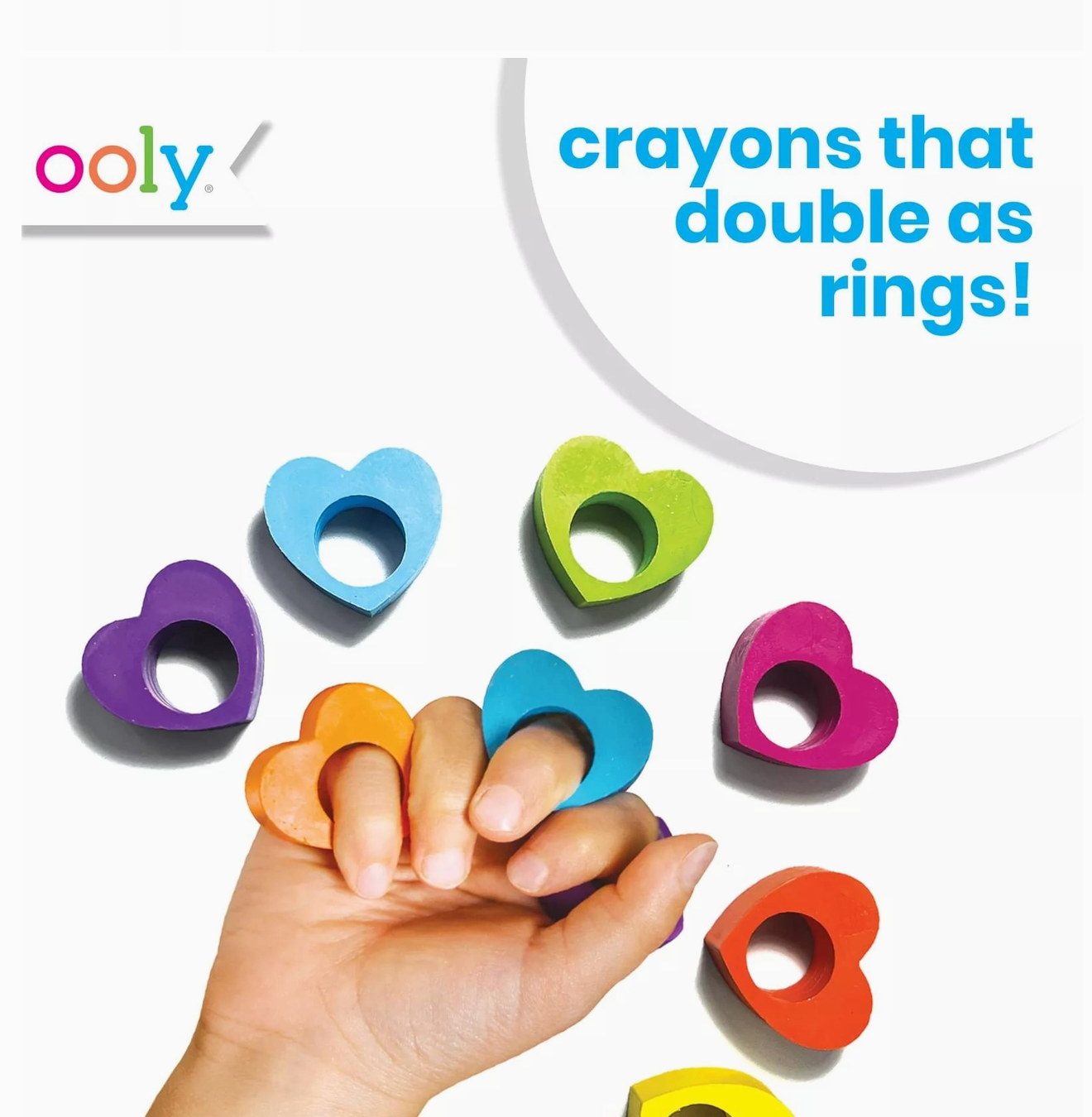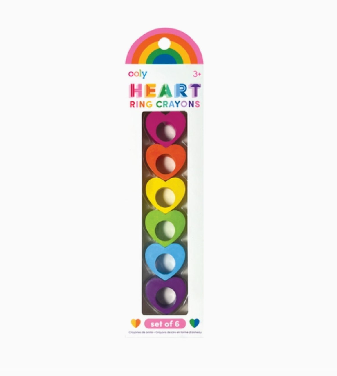 • Heart ring crayons • Set of 6 wearable crayons in fun rainbow colors • Wear them or share them with friends • Wear one or more on your fingers to experience a new way to color • Suitable for ages 3 and up