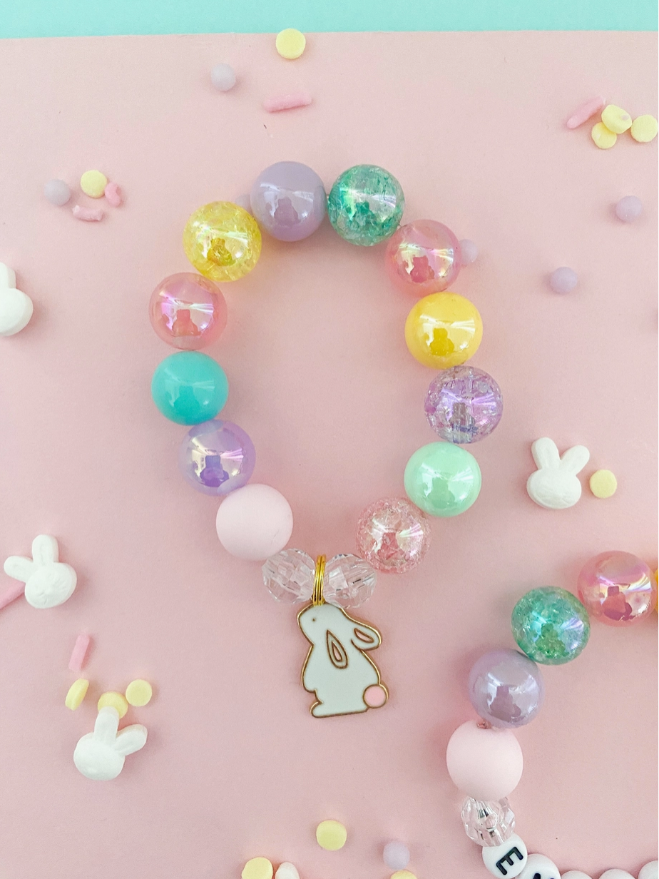 Bracelet made with 8mm and 12mm acrylic beads and one enamel charm strung on stretch cord.