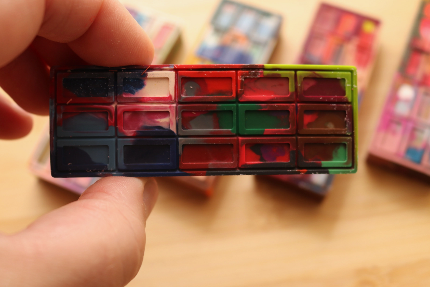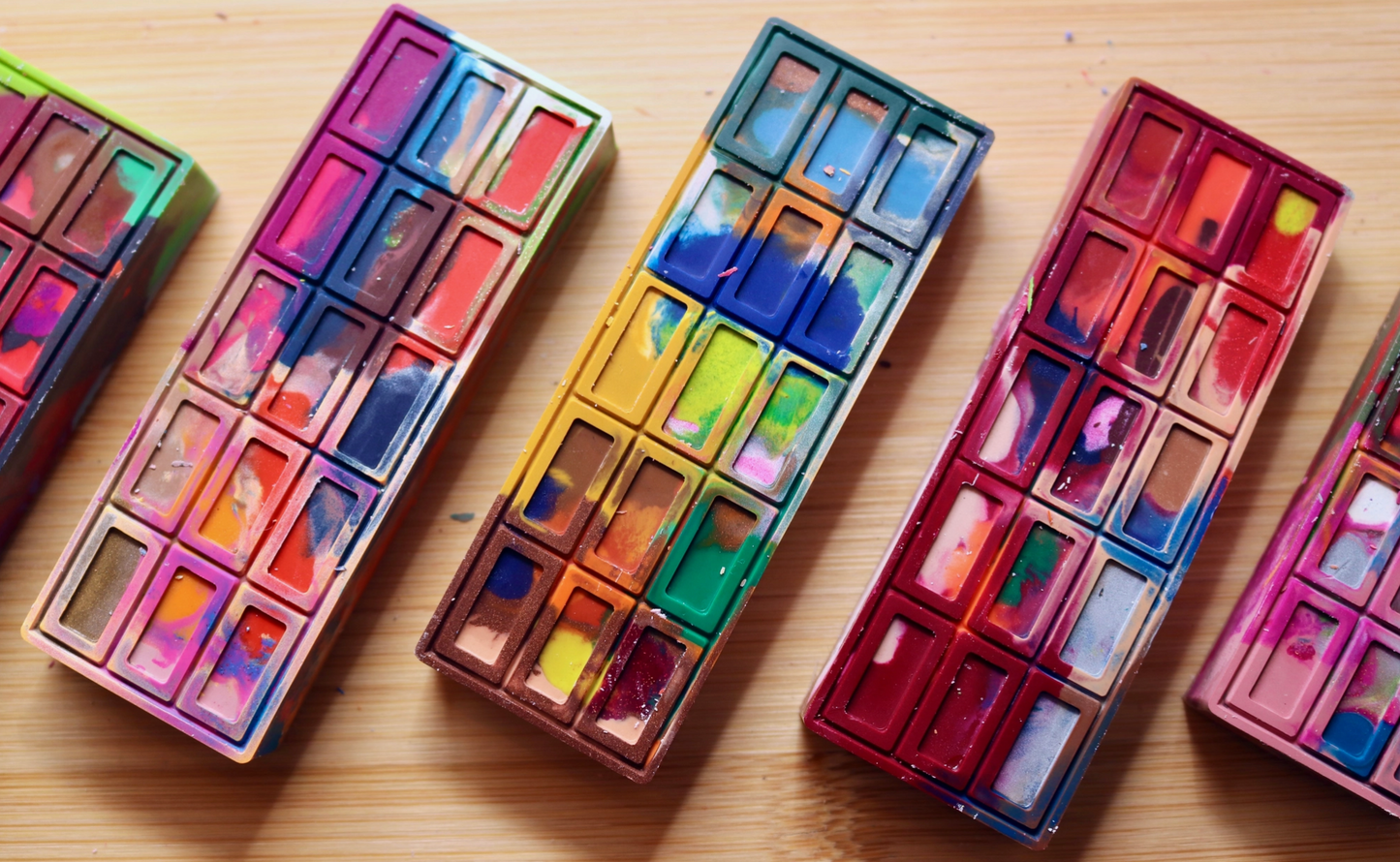 We manually break them down by removing labels, glue and any residue, and then wash them in a gentle mix of antibacterial soap and water. They are completely air dried before melting them down to the colorfully whimsical creations you see before you!