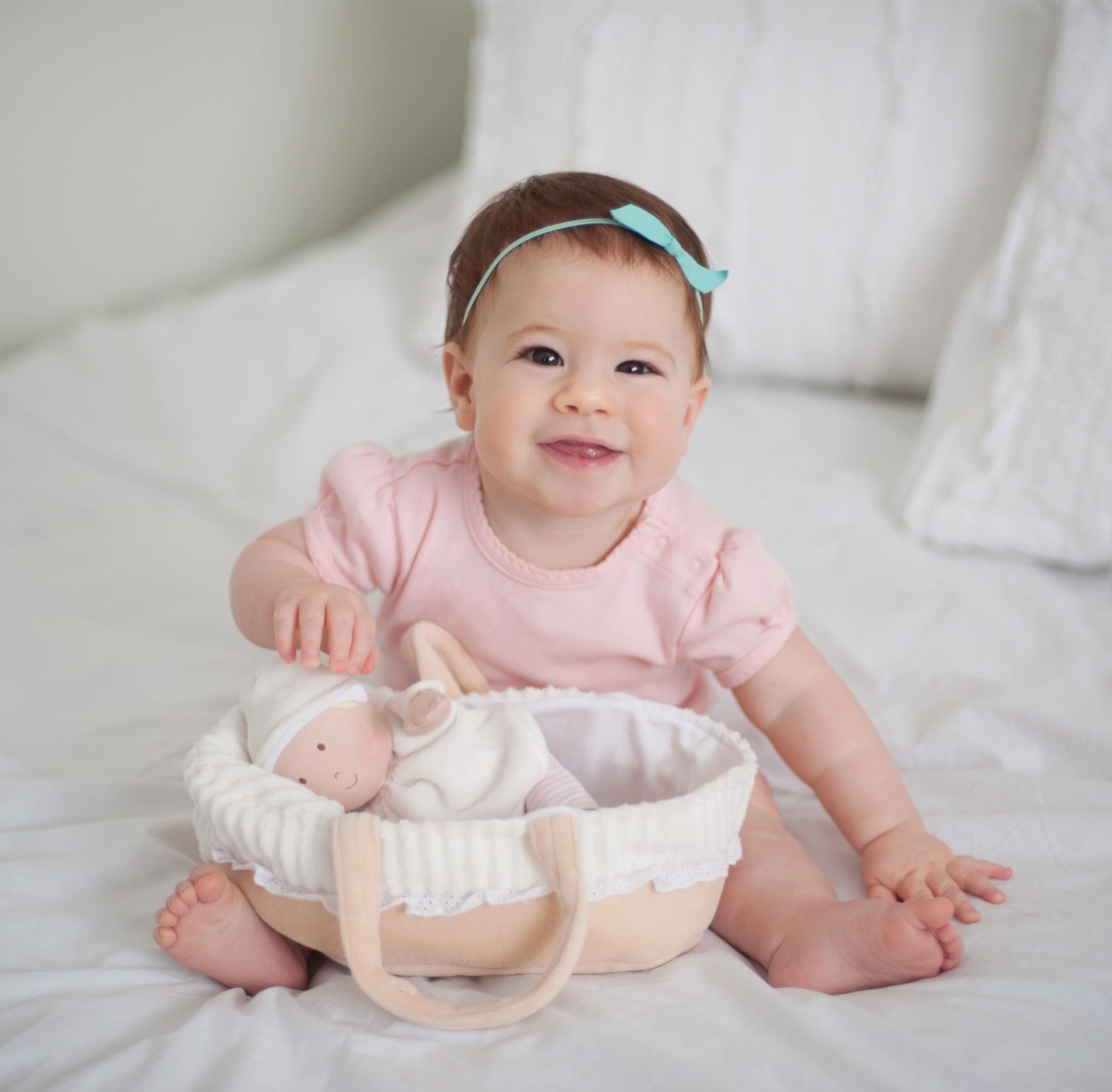 The delicately embroidered features and bandana make her a super cute choice. Age Recommendation -0+ months Doll Size: 10 inches Skin, Bib, Soother and Blanket - 100 % Cotton Single Jersey Dress and Bandana - 100 % Cotton Single Jersey Carry Cot - Knitted Fabric