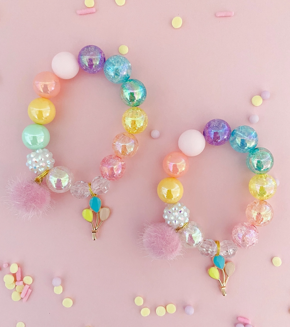 Perfect for birthdays, graduations and any other special day! Bracelet made with 8mm and 12mm acrylic beads, 1 enamel charm and an adorable pink pom pom strung on stretch cord.