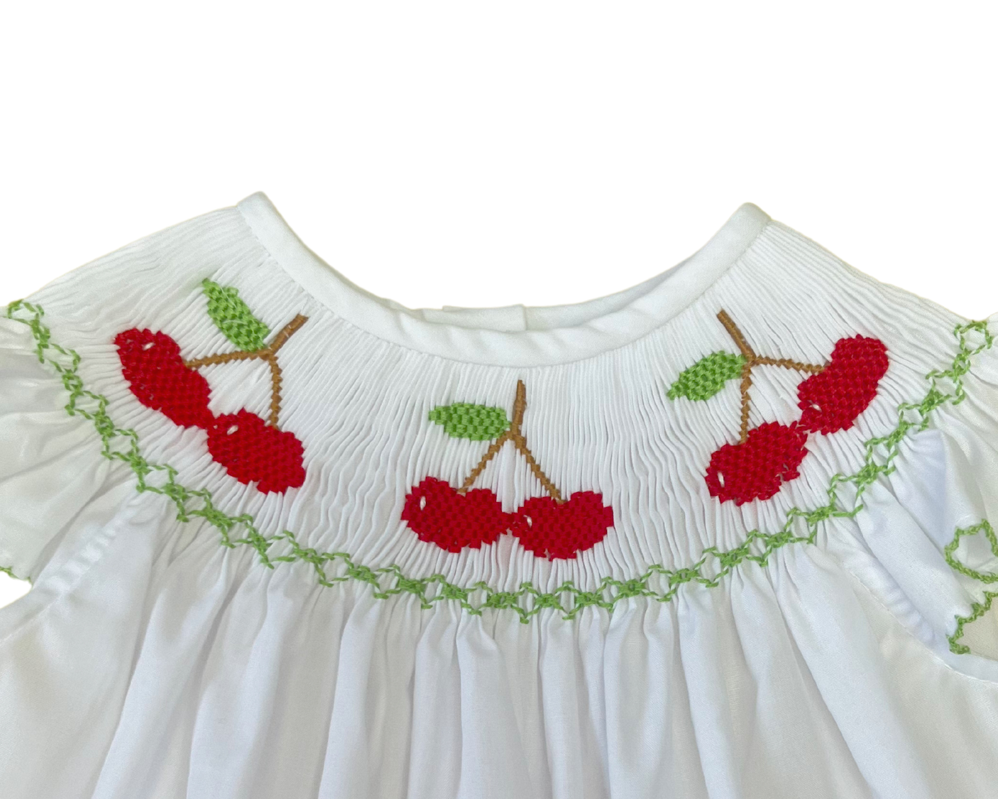 This sweet smocked bubble with cherries is perfect for a hot summer day!