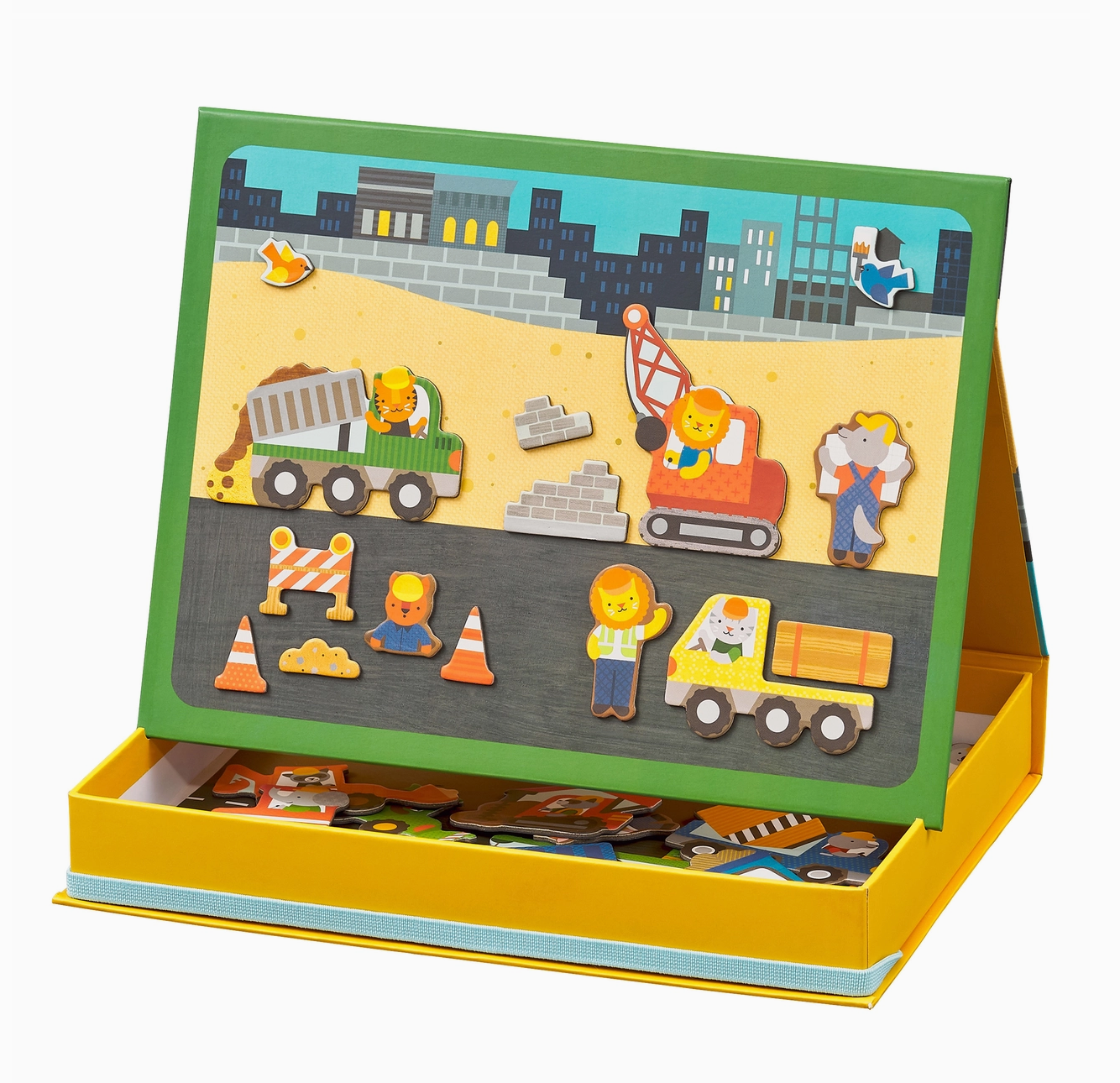 Decorate two construction scenes with little busy animal workers in this Construction Site Magnetic Play Scene from Petit Collage. This portable play set features 2 magnetic scene backgrounds and 40 magnetic pieces.