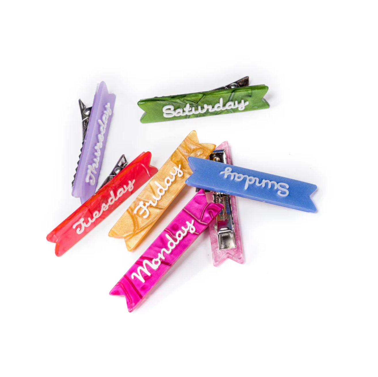 A fun way to keep track of the week! These handmade hair clips feature the days of the week in fun, textured colors—from Sunday’s soft blue to Friday’s golden glow. Making getting dressed a little more fun every day!