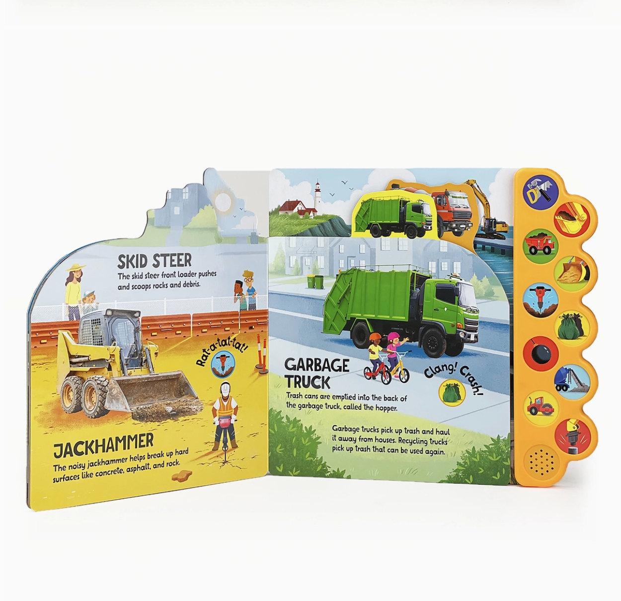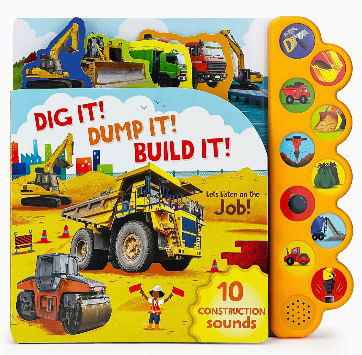 Let's all sing along with this sound book as we explore construction work, tools, and machines! Explore the construction site to learn about the tools and each kind of truck used to build, from bulldozers and dump trucks to jack-hammers and cement mixers. Push the audio buttons that correspond with the icons on the page - pushing buttons on books with sound helps enforce fine motor development and practice matching skills.