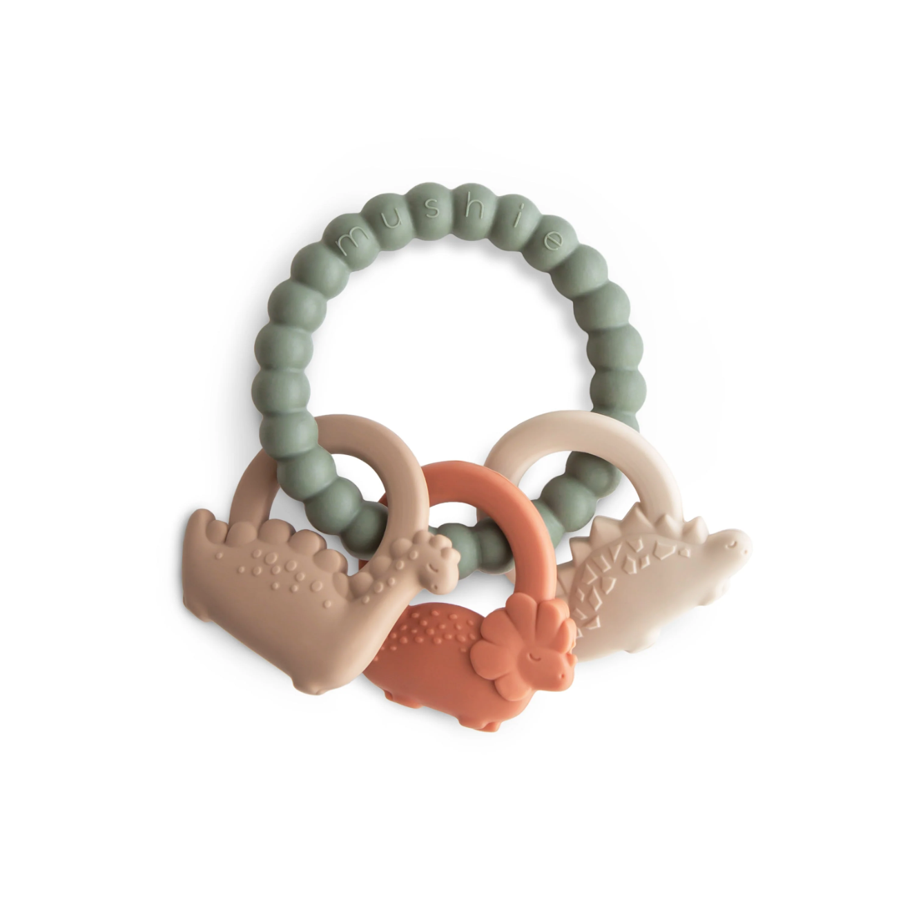 Help little ones explore sensory rich shapes and textures with a teething ring that features three prehistoric dino creatures. Made from 100% food grade silicone, teething babies will enjoy sinking their gums into the soft material that satisfies the natural urge to chew. Featuring four earthy colors and a raised leaf texture around the ring, this toy inspires playful moments and creates opportunities for discovery.