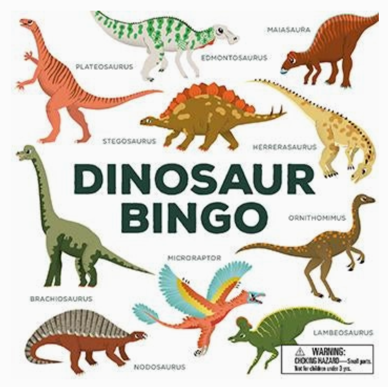 Dinosaur Bingo contains 48 illustrated dino chips and a cardboard dino head to store them in, a game board, eight double-sided bingo cards, and Jurassic counters for you to mark up your card.