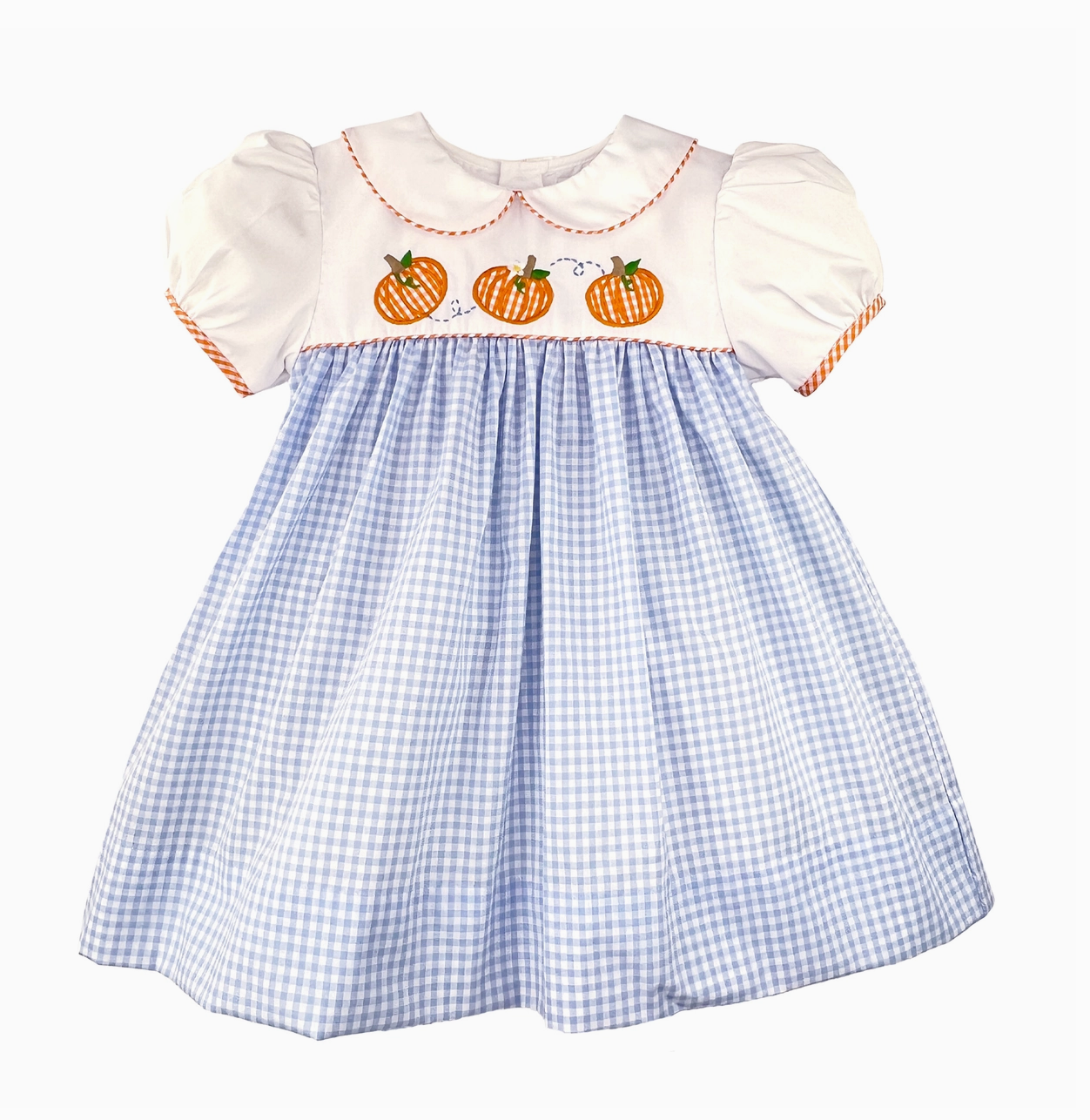 This adorable dress comes in a blue check fabric with a white top with three pumpkin appliques on the front and a peter pan collar with orange trimmed edges for a little extra detail. This adorable harvest dress is made with a cotton-poly blend fabric that is lightweight, airy and machine washable for easy care!
