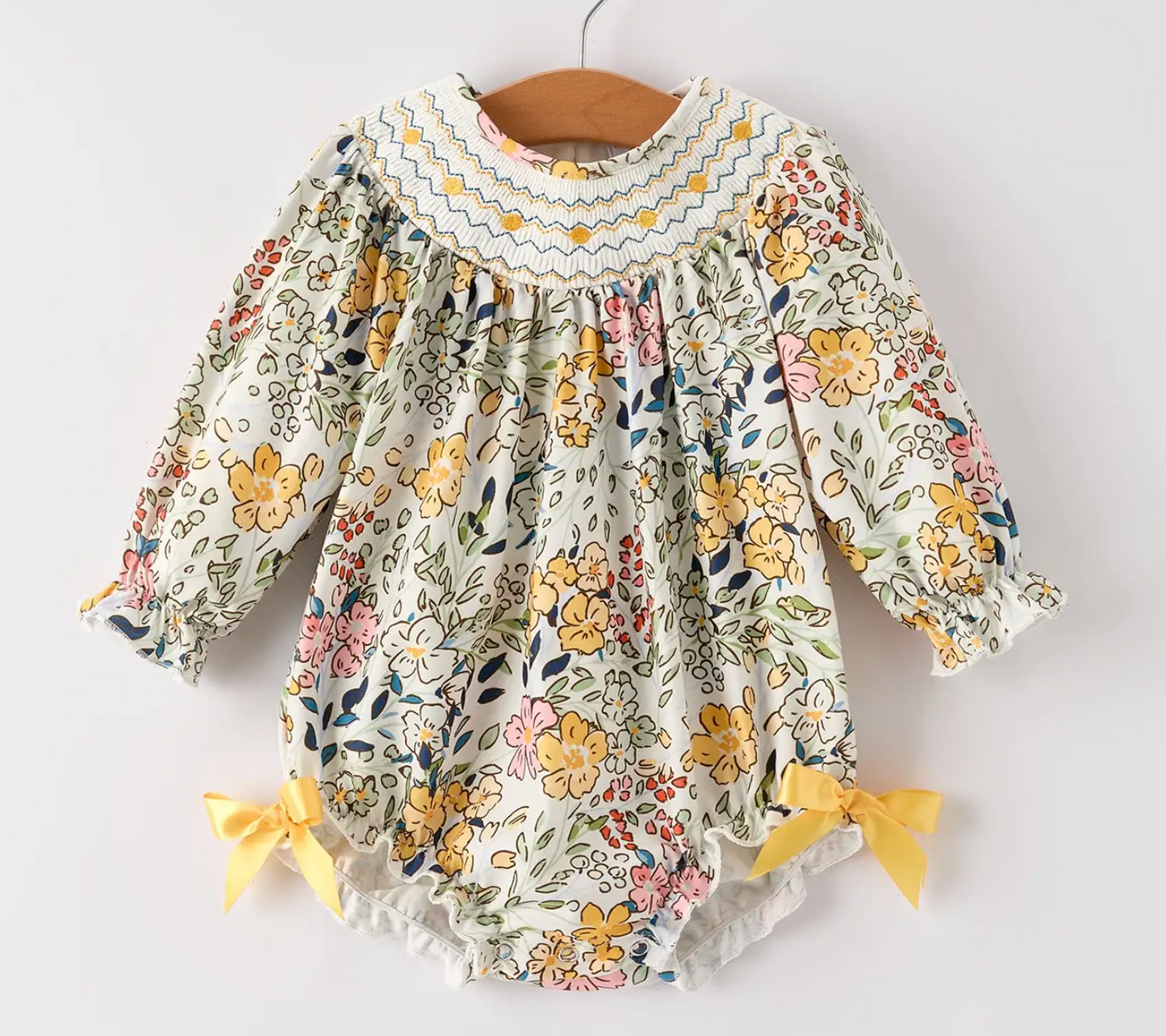 Fall Embroidery Smocking Bow Floral Leaf Baby Girls Romper