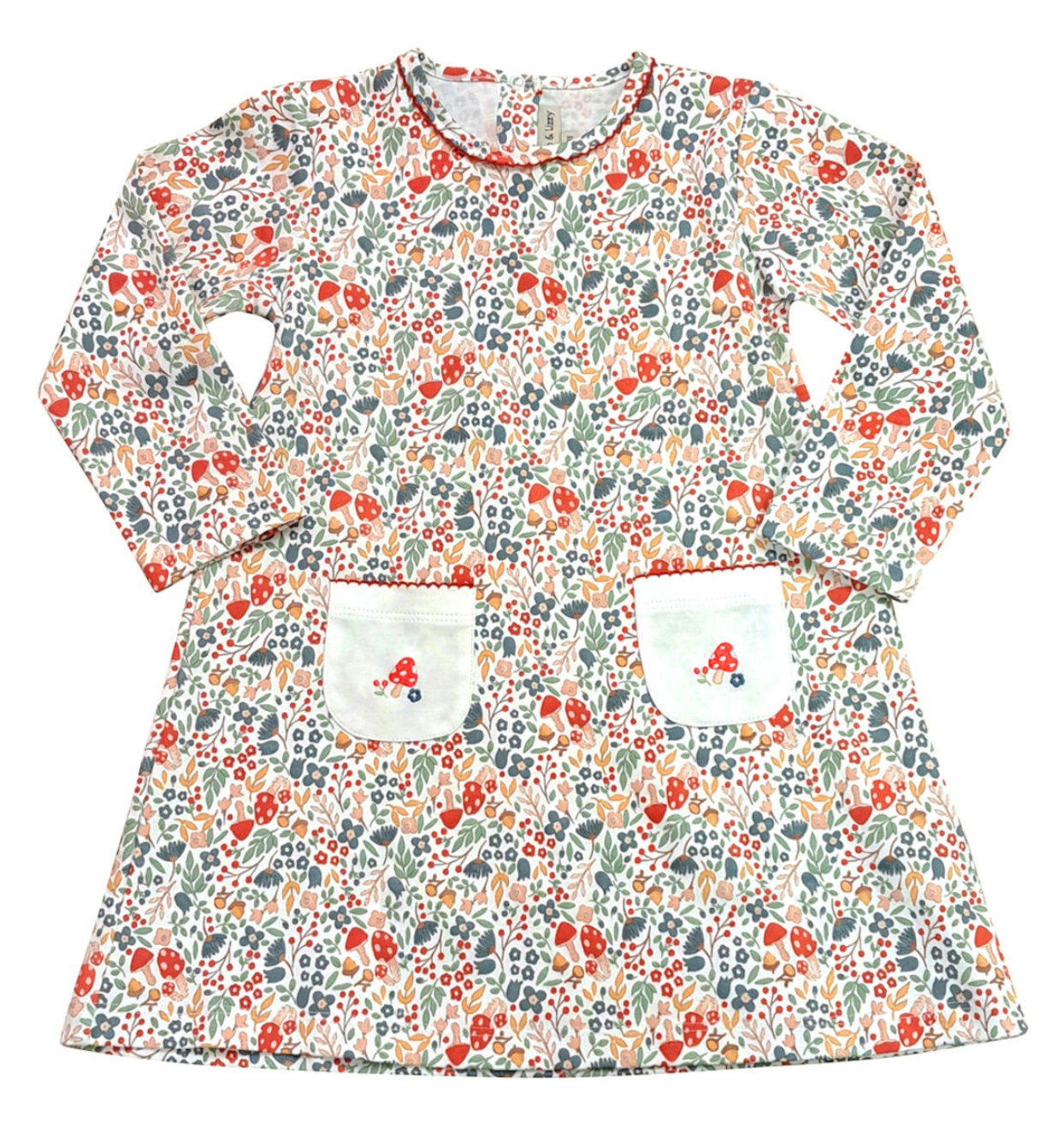 Fall Flowers and mushrooms printed on 100% soft pima cotton girl's A-line dress with pockets. Made in Peru.