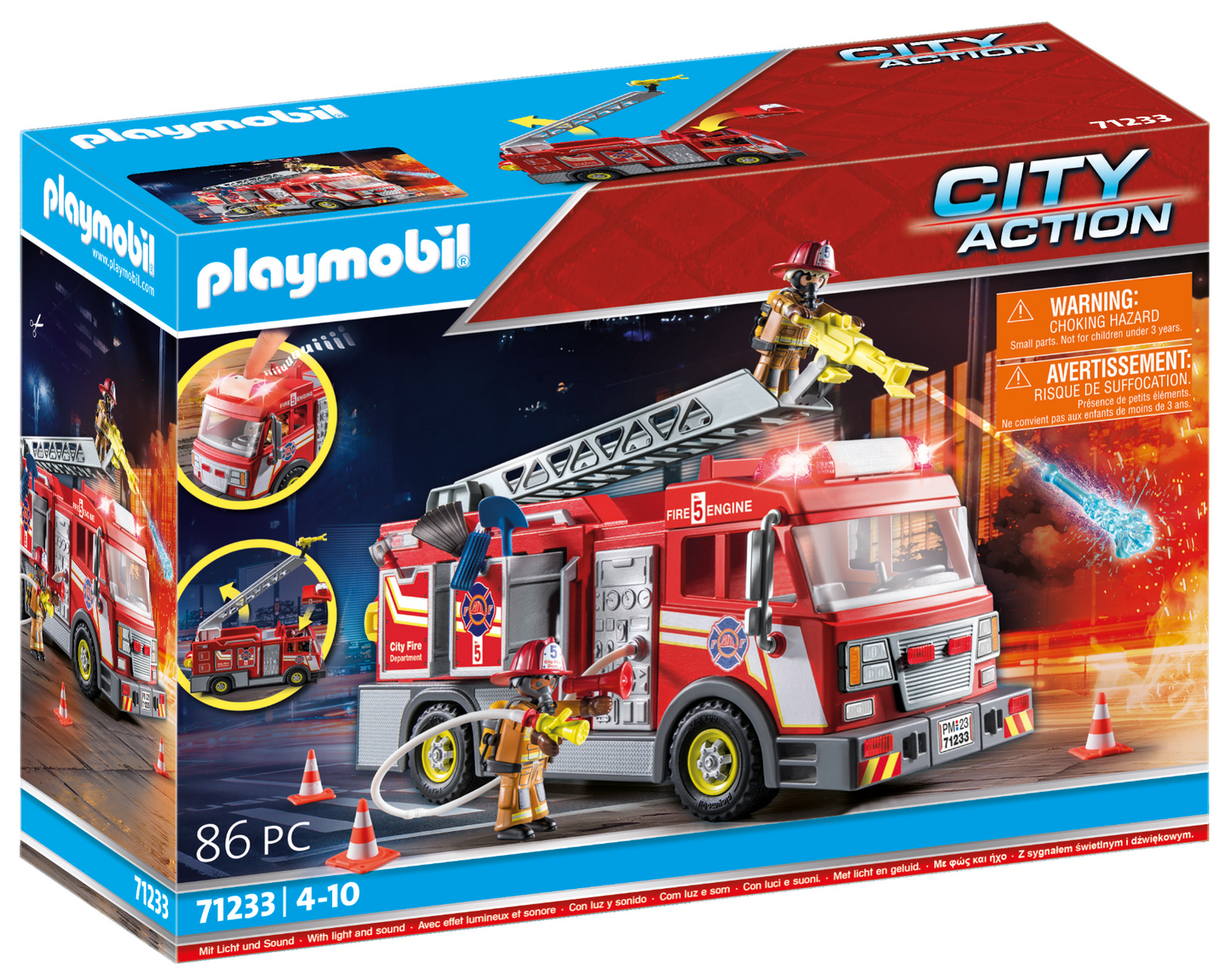 Be a hero in PLAYMO City with the PLAYMOBIL Fire Truck, featuring a ladder that spins and a rotating and swiveling water cannon to knock down the flames with the water arrows. Equip your figures with a respirator and oxygen tank for the rescue mission. Use the large compartments on both sides of the vehicle to store the mission equipment. Set includes two figures, megaphone, radio, oxygen devices, water cannon, and other accessories. 1 x AAA battery required. Dimensions: 12.2 x 4.9 x 14.3 in (LxWxH) (with ladder) Recommended for ages four to ten years. Warning. Choking Hazard. Small parts. Not for children under 3 years.