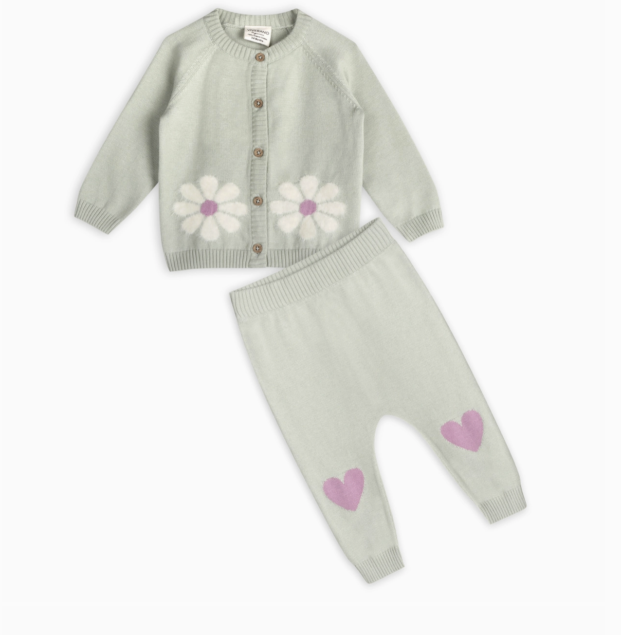 Flower & Heart Baby Sweater Cardigan & Pants Set - Organic