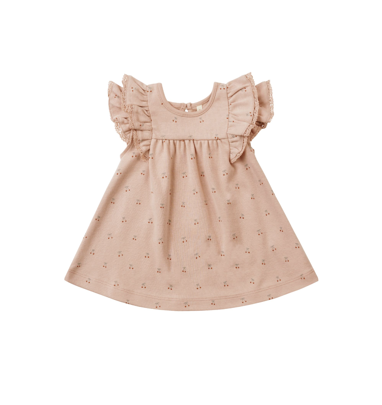 | Velvety soft flutter sleeve dress with back button closure. All sizes include coordinating bloomers. Featuring our ‘cherries’ all-over print on blush. Care: Machine wash cold. Tumble dry low. Made of 100% Organic Cotton |