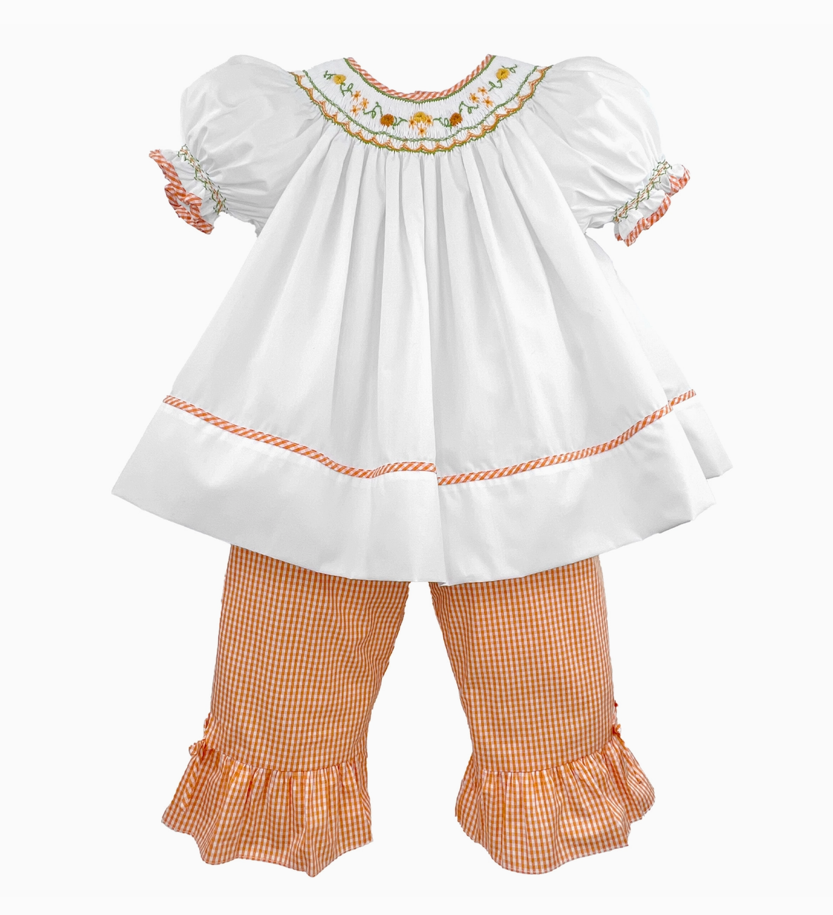 A sweet and stylish outfit that is perfect for everything fall to Thanksgiving to any special occasion! Our harvest bishop smocked outfit set comes with a short sleeve shirt in a soft white fabric with floral smocking in an orange fall color scheme.