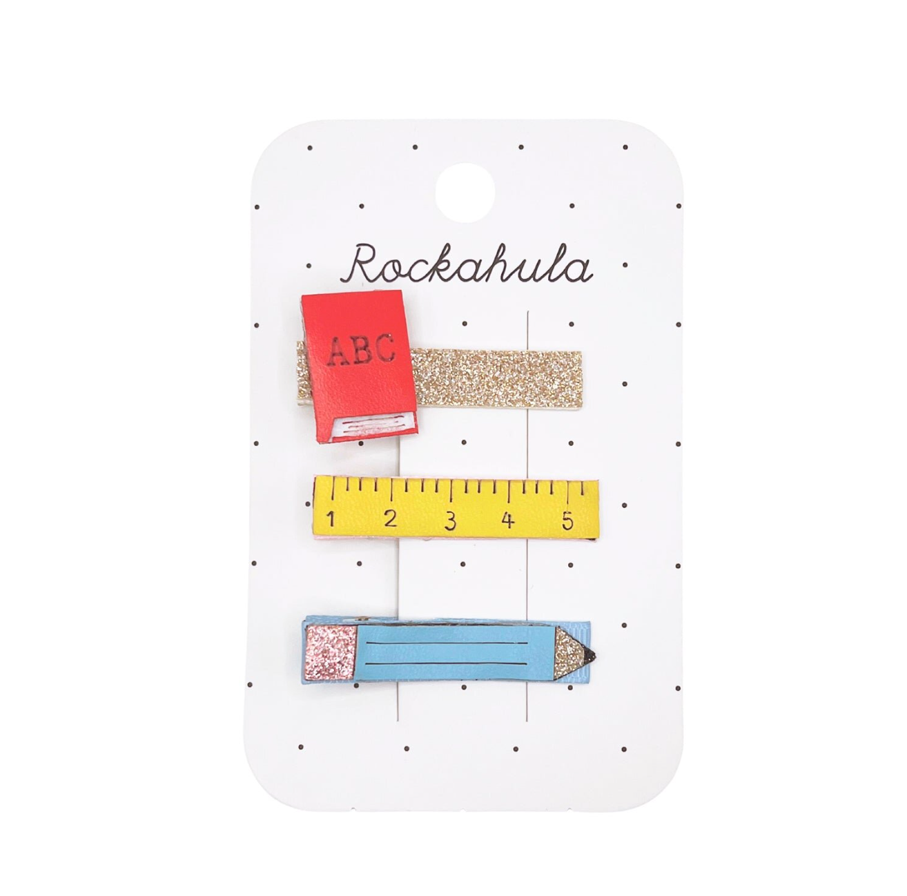 This set of three clips are the perfect addition to any school uniform and also make a lovely back to school gift. Featuring a pencil, ruler and notebook made in primary colours, all sat upon gold glittery salon bar clips - providing a comfortable fit to little heads!