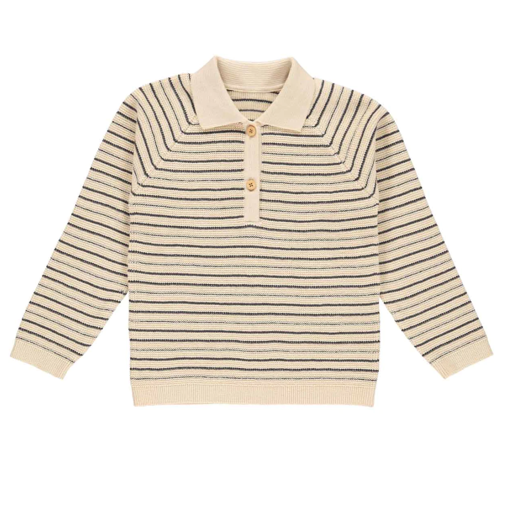 Smart knitted jumper with transverse navy blue stripes and fine collar.